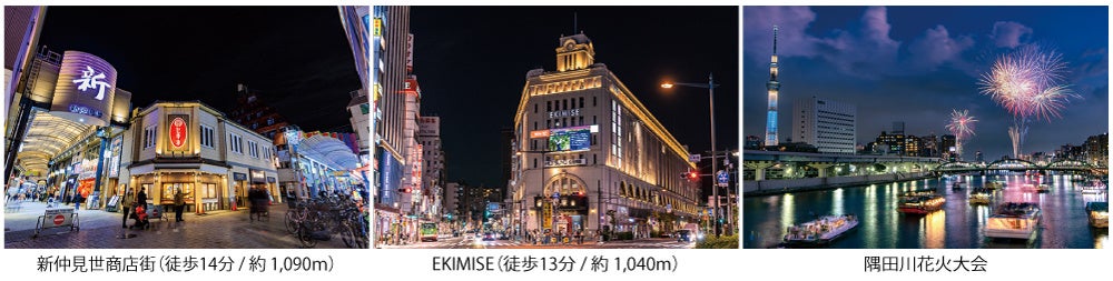 5つのエリアに分かれた浅草最大のアーケード商店街である「新仲見世商店街」を日常の一部とし、無印良品やダイソーなど人気店が集結する「浅草ROX」や、仲見世と駅が融合した複合商業施設「EKIMISE」など、生活を快適に支える商業施設も充実しています。さらに、夏の風物詩である隅田川花火大会を身近に楽しめるという、都心では希少な特別なロケーションを享受できます。