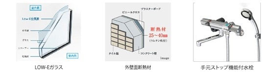 本物件は、「ZEH-M Oriented」認証を取得しています。ZEH-M Orientedとは、高い断熱性能と高効率な設備システムにより、快適な室内環境を維持しながら、マンション全体の年間一次エネルギー消費量を20%以上削減することを目指すものです。省エネ性と断熱性向上のため、「LOW-Eガラス」や「外壁面断熱材」、節水効果のある「手元ストップ機能付水栓」も導入しています。