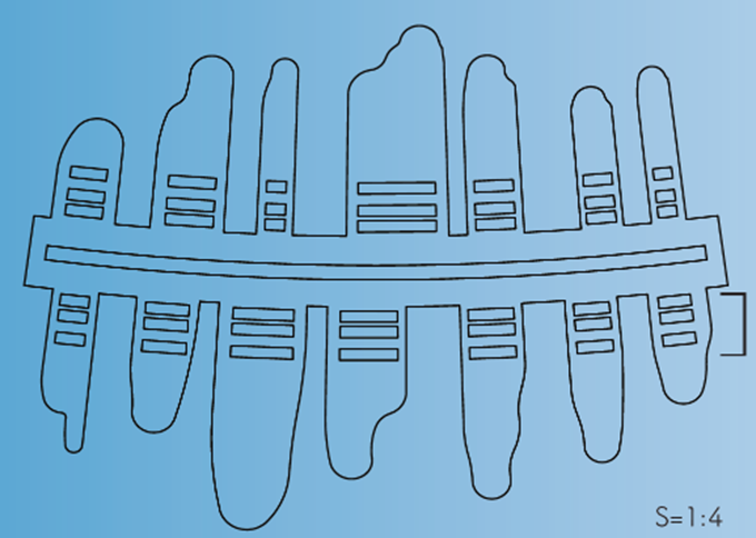 中心角15度の円弧で水面を、ランダムに並んだ材で檜をポケット加工で反射光を表現しています。