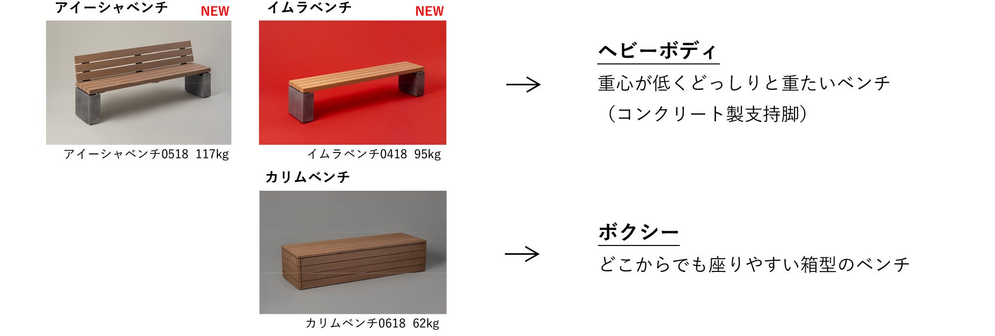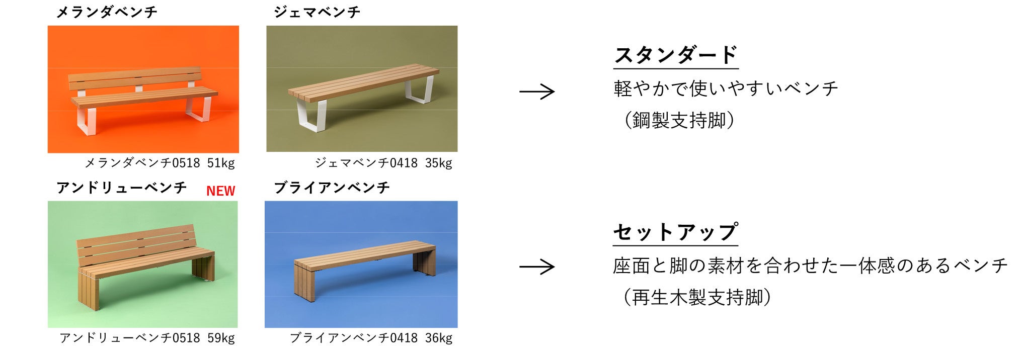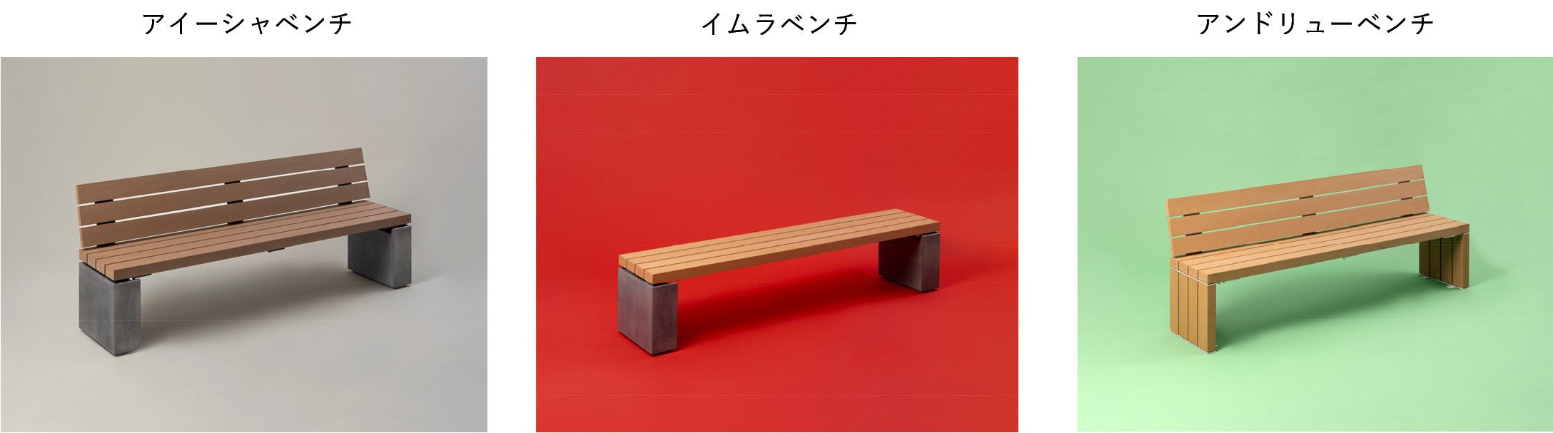 今回、新たに追加する3プロダクトは、ファンダラインシリーズ初となるコンクリート製⽀持脚を採⽤した背ありタイプの「アイーシャベンチ」と背なしタイプの「イムラベンチ」、⽀持脚と座⾯、背もたれの素材を同じ再⽣⽊製にして⼀体感のある「アンドリューベンチ」 となります。