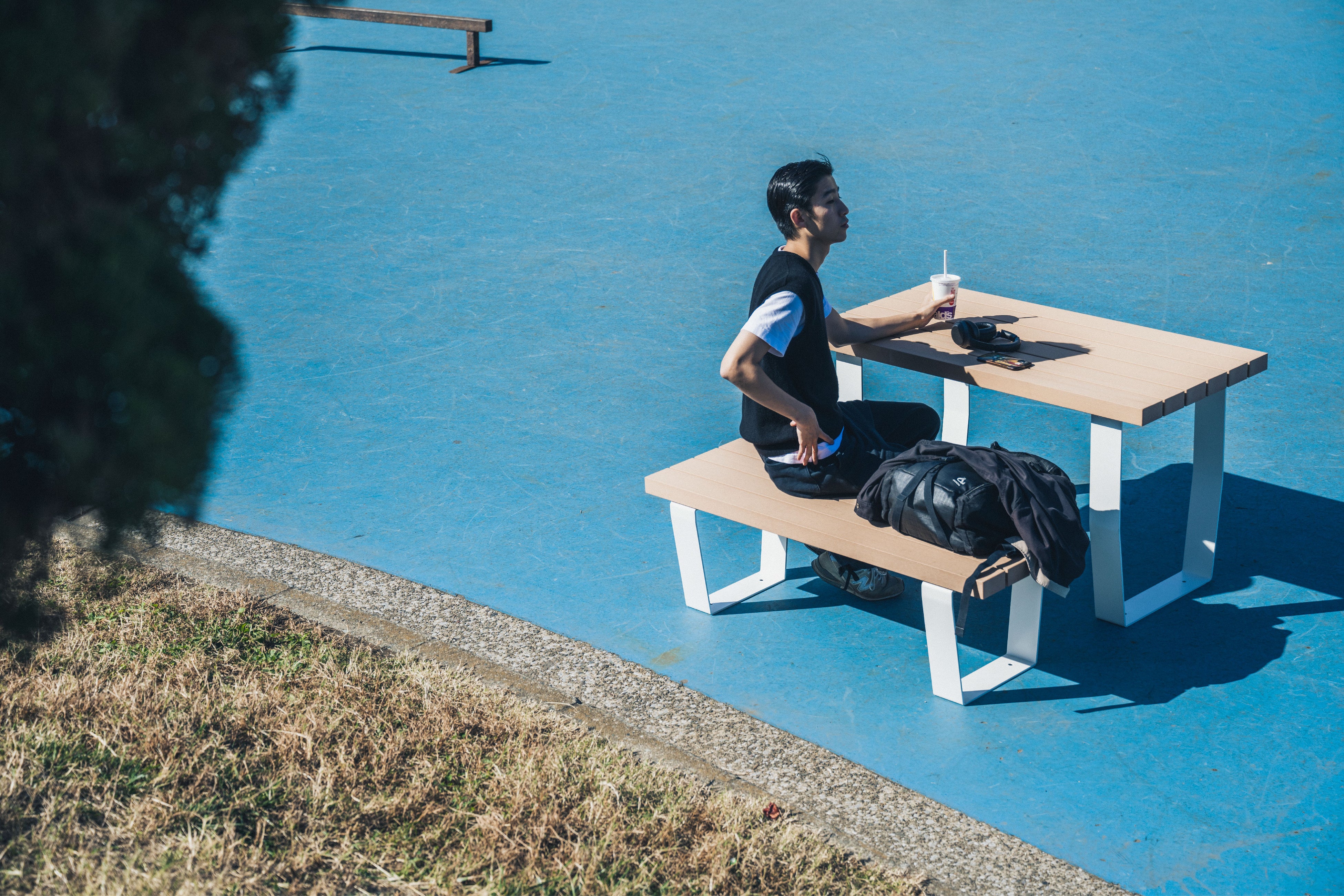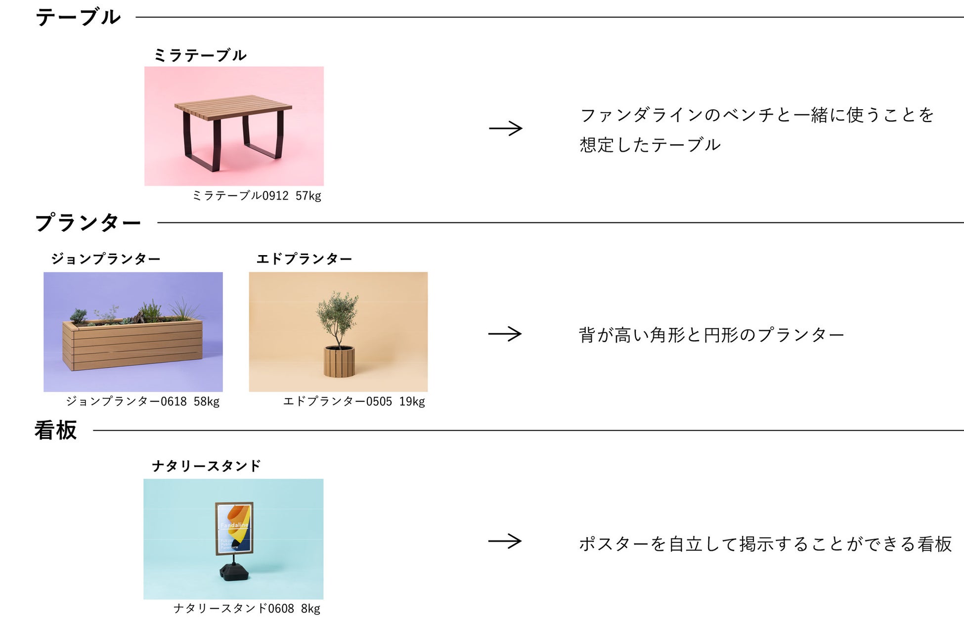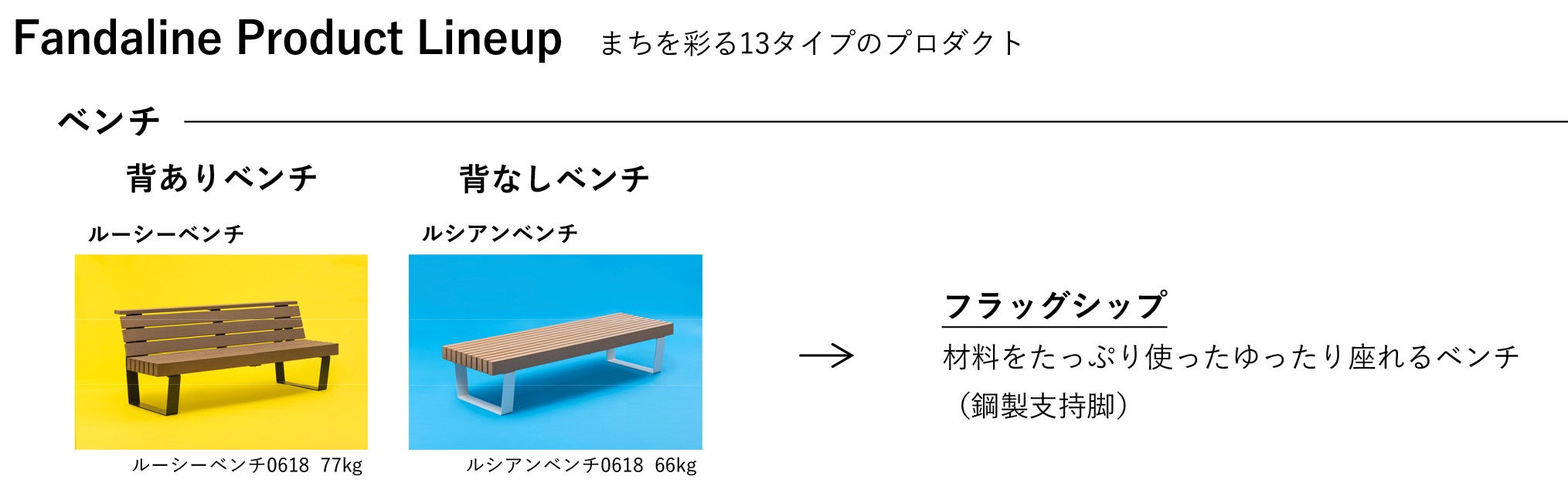 ファンダラインは、「まちってもっとたのしいはずだ」をスローガンに、⾃然と⼈々を迎えいれてくれる普遍的でやさしいデザインを⼼掛け、⼤きな広場から建物の軒先まで、さまざまな「まちの1階」に⼈が⾃由にいられる場所を提供することを⽬標にした、屋外家具ブランドシリーズです。主素材には、フクビ化学⼯業の独⾃技術で⽣産する⽊粉と樹脂を組み合わせた再⽣⽊材「プラスッド」とすることで、⾬ざらしで使⽤できる耐久性を備えており、これまで、背ありベンチ、背なしベンチ、テーブル、プランター、看板の5種類10プロダクトを展開しておりました。