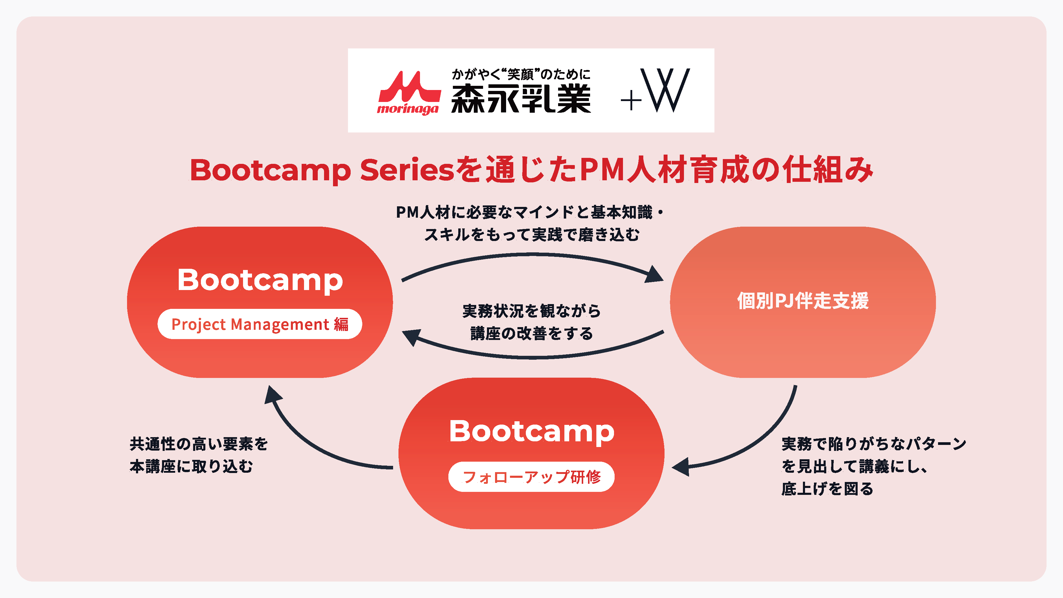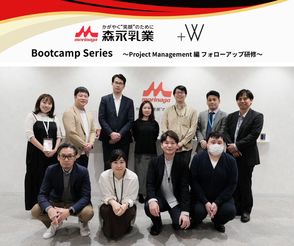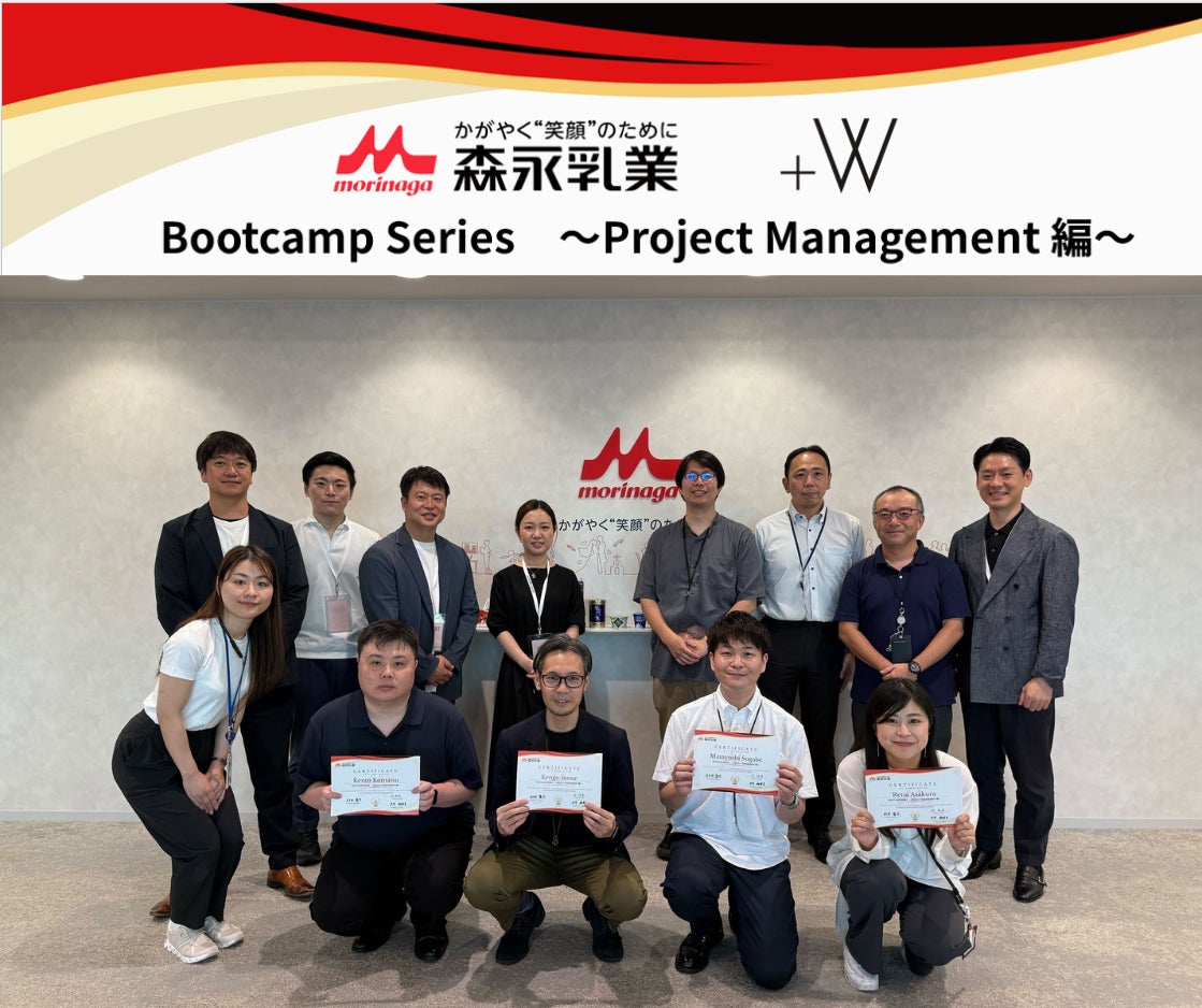 Plus W株式会社(本社:東京都渋谷区、代表取締役社長:櫻井 稚子、以下「Plus W」)は、森永乳業株式会社(本社:東京都港区、代表取締役社長:大貫 陽一、以下「森永乳業」)の「森永乳業グループ10年ビジョン」達成におけるDX人材育成の重要性を踏まえ、プロジェクトマネジメント人材(以下、「PM人材」)の育成が急務と考え、当社が伴走体制のもと、森永乳業の実プロジェクトを題材にした、テーラーメイドの実践型PM人材育成プログラム「Bootcamp Series ~Project Management 編~」を実施いたしました。また、2026年4月より第2期も開始し、カリキュラムの拡充、DX経験の有無を問わず参加し、成果創出に繋げるプログラムへの発展に挑戦します。