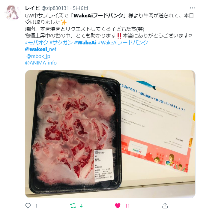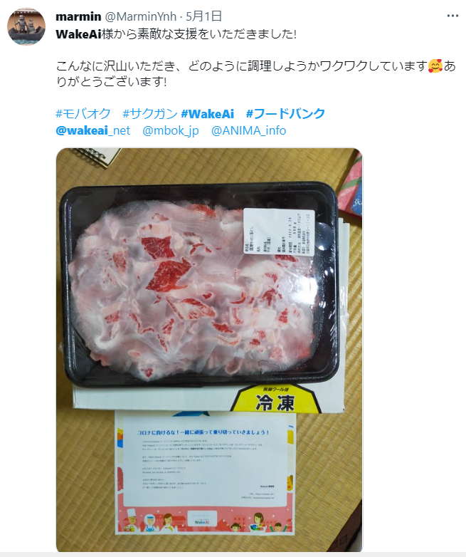 モバオクにて開催中のTVアニメ「サクガン」チャリティーオークション企画、「3社合同のWakeAiフードバンク」第三弾「40世帯へ国産牛肉500g」の配送を完了