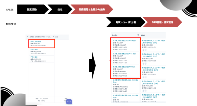 契約期間に基づいてサブスク管理のパイプラインに取引が自動分割します。そのため、サブスクリプションの取引レコードを契約期間分作る必要がなくなります。