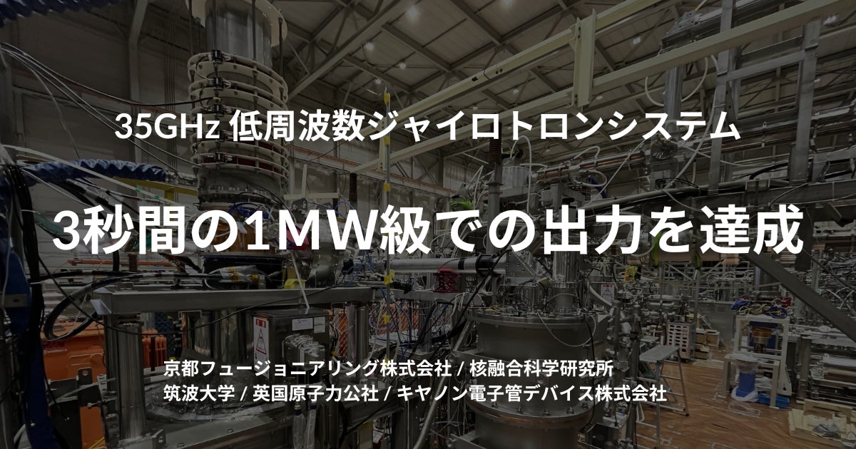 京都フュージョニアリング株式会社(以下KF)、核融合科学研究所(National Institute for Fusion Science:以下、NIFS)、国立大学法人筑波大学(以下、筑波大学)、英国原子力公社(UK Atomic Energy Authority:以下、UKAEA)およびキヤノン電子管デバイス株式会社(以下、キヤノン電子管デバイス)の国際産学共同研究グループは、35GHz低周波数ジャイロトロンシステムの性能試験において、60GHz以下の低周波数ジャイロトロンでの最大級かつ最長級となる3秒間の1MW級での出力を実現しました。