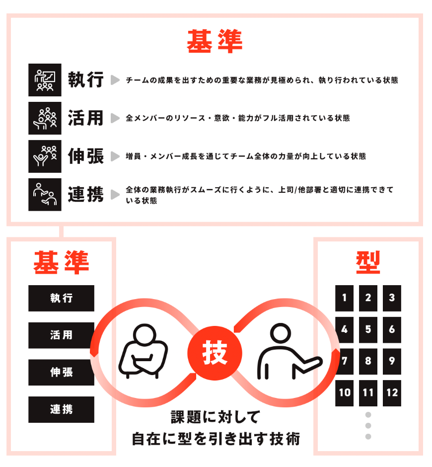 EVeMでは、4つの”基準”(執行・活用・伸張・連携)を用いて「マネジメントができている状態」 を定義しています。再現可能なマネジメントの技術とその実践方法を60個の型に整理し、こだわり抜いたトレーニングを掛け合わせたマネジメントプログラム「マネ型」として提供しています。