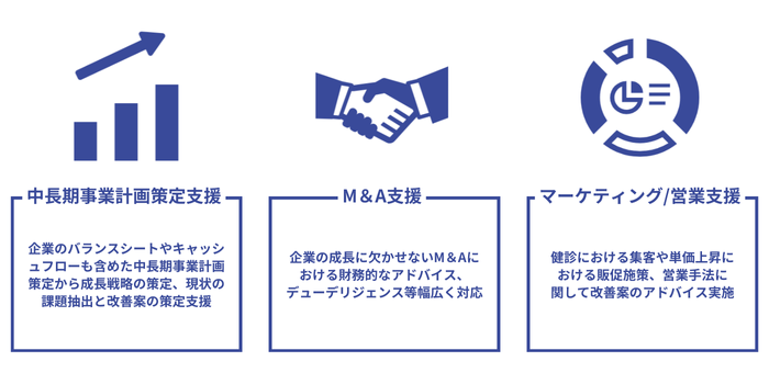 中長期事業計画の策定支援をはじめ、M&A支援、マーケティング/営業支援など、健診機関の課題に対し、幅広いソリューションをご提供します。