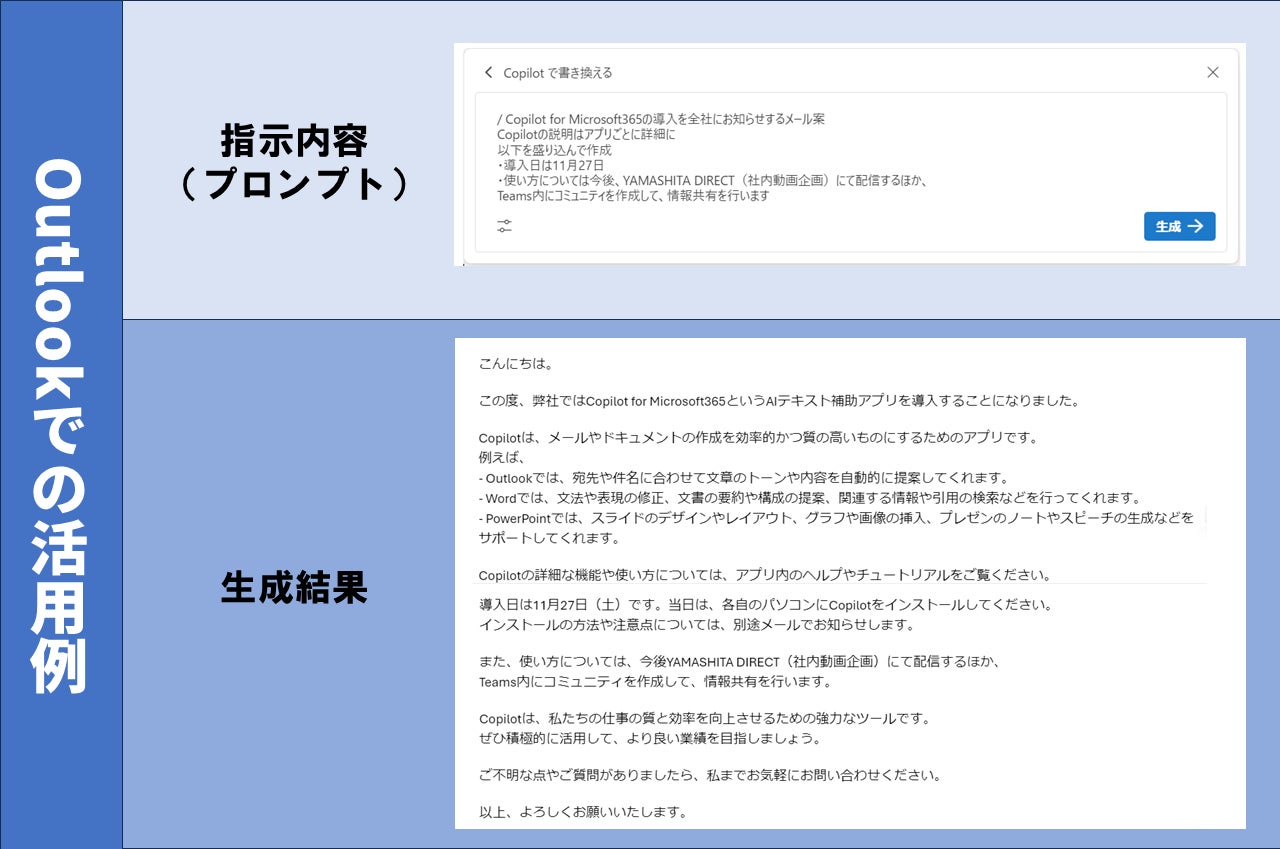 ・社内文書を読み込ませ、社内報の記事や各種報告書などは、自然言語に基づく指示で初稿を作成する