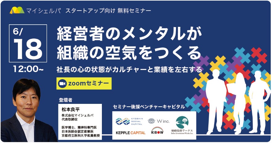 オンラインカウンセリングを提供する株式会社マイシェルパ(以下、当社)は、スタートアップ向けオンライン無料セミナー「経営者のメンタルが組織の空気をつくる 〜社長の心の状態がカルチャーと業績を左右する〜」を6月18日(水)に開催します。