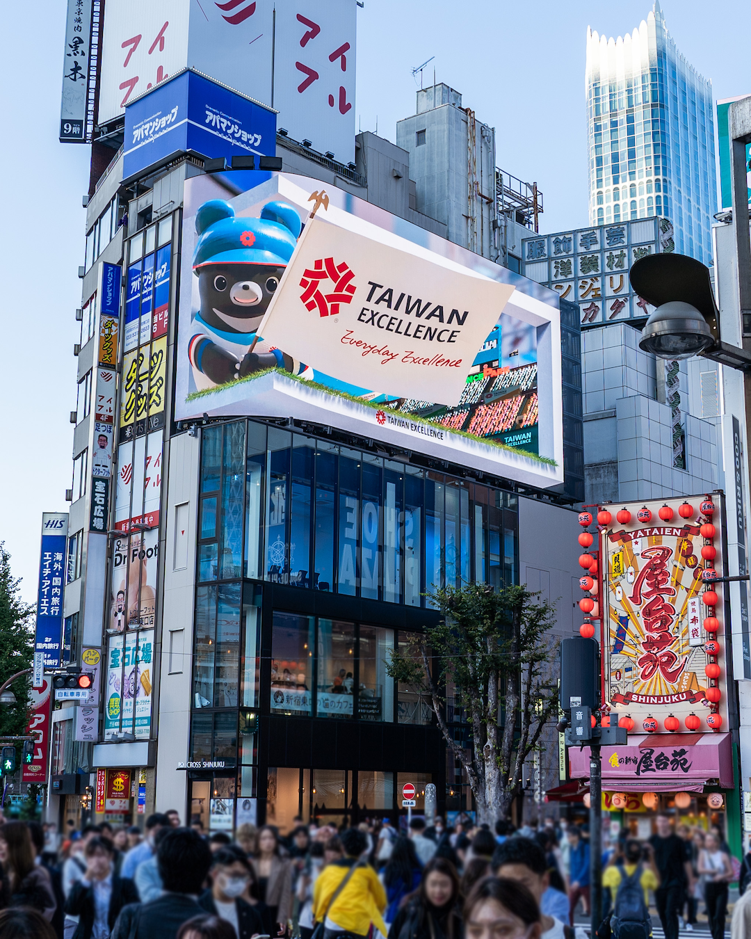 台湾エクセレンス賞は、経済部国際貿易署と台湾貿易センター(TAITRA)が実施する対外プロモーションにおいて重要な役割を担う賞で、企業が受賞に至るまでには、国内外の140名の審査員による審査を通過する必要があります。今回は産業界全体のイメージアップを図るべく、巨大3D猫で世界的に知られる新宿東口の「クロス新宿ビジョン」にてプロモーションを実施します。さらに11月5日から11月11日までは、隣の「新宿アルタビジョン」も合わせた2面同時露出により、プロモーション効果をいっそう高めます。これらの広告スペースは人通りが極めて多く、新宿を訪れる外国人観光客が必ず通る位置にあります。今回の3D広告では、台湾の優れた製品がもたらす暮らしの体験の向上を象徴するものとして、台湾エクセレンスチームを代表する指名打者として福熊くんが大事な場面でホームランを放つシーンが放映されます。