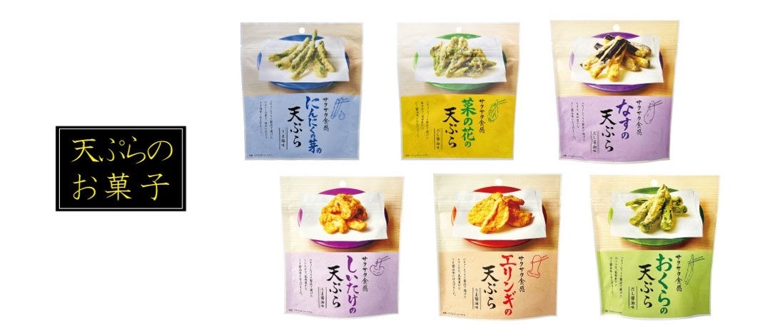 販売中の惣菜菓子「天ぷらの菓子シリーズ」はバキュームフライ製法でじっくり低温で揚げることで野菜の風味をそのまま残し、サクサク食感が楽しめるお菓子です。天ぷらを食べるように、塩味や風味豊かなだし醤油味、うま醤油味など素材ごとに合う味付けにしております。おやつのように食べられる惣菜菓子をお楽しみください。