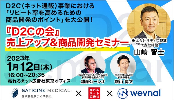 サティス製薬×売れるネット広告社×wevnal登壇!D2C(ネット通販)事業における「リピート率を高めるための商品開発のポイント」を大公開!『D2Cの会』売上アップ&商品開発セミナー