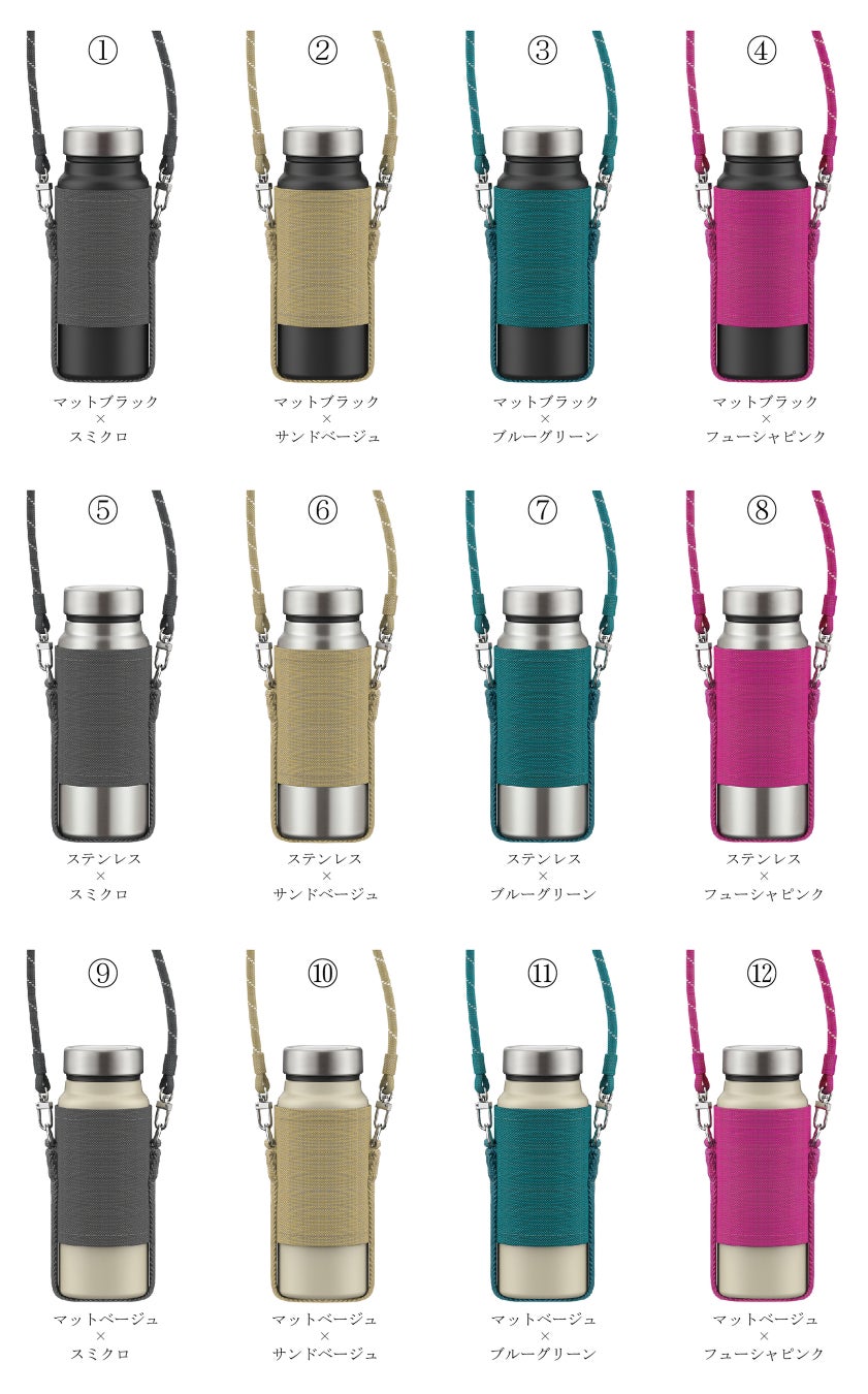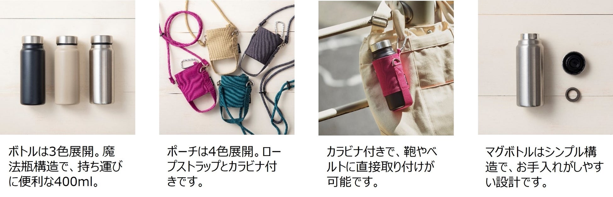 商品はマグボトル本体と、ロープストラップ・カラビナ付きのポーチがセットになっており、ボトル3色とポーチ4色の組み合わせで、最大12通りの中から自分らしいスタイルをお楽しみいただけます。