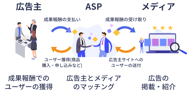 アフィリエイト広告とは、メディアに掲載した広告経由で、広告主の設置する成果(商品の購入、サービスのお申し込み、お問い合わせなど)が発生した際に、成果報酬をメディアに支払う広告手法のことです。