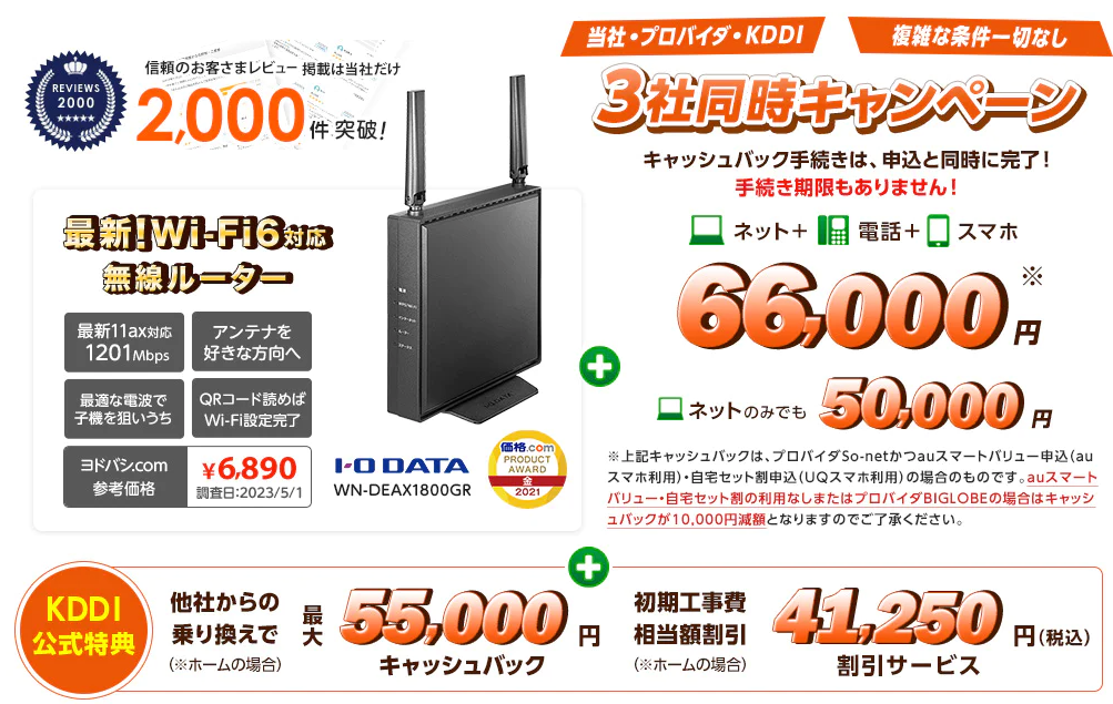 →他社光回線からのお乗りかえで発生した解約違約金をKDDIが最大30,000円まで還元+更に最大25,000円