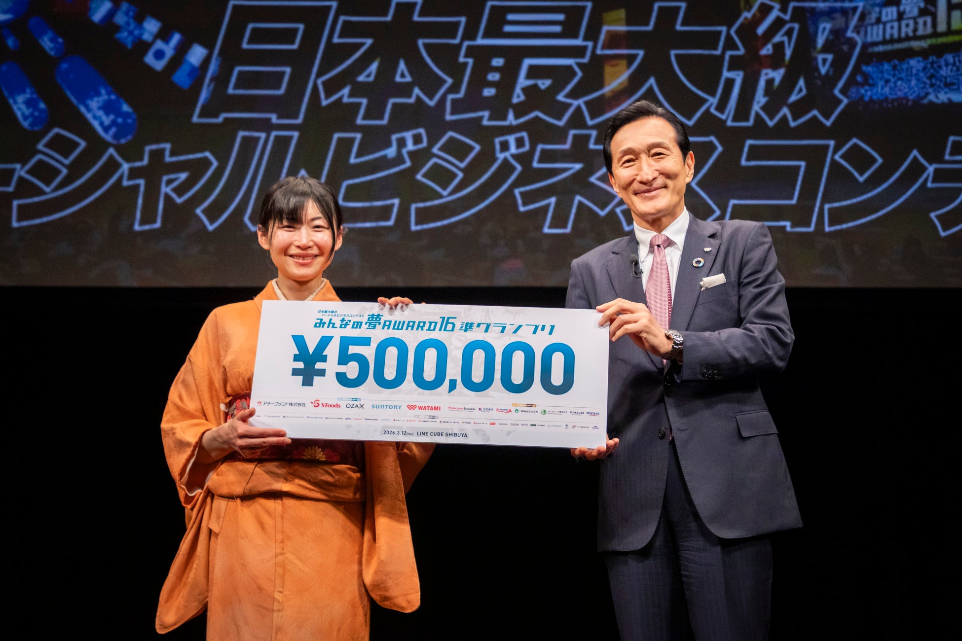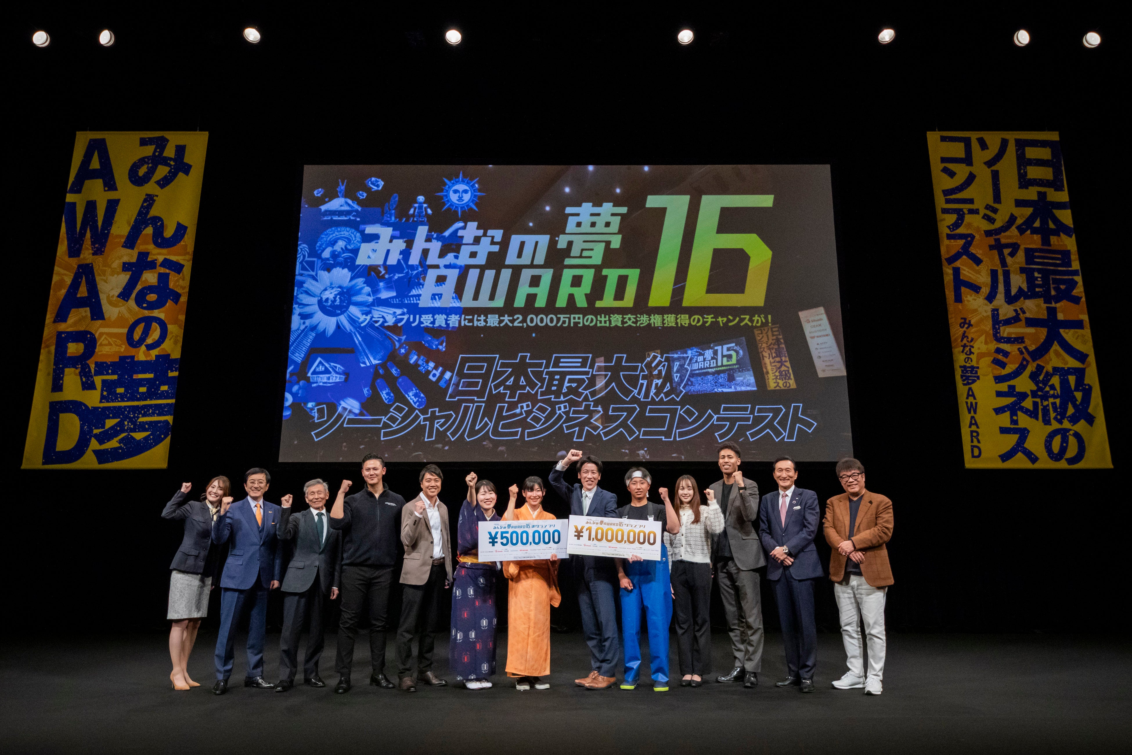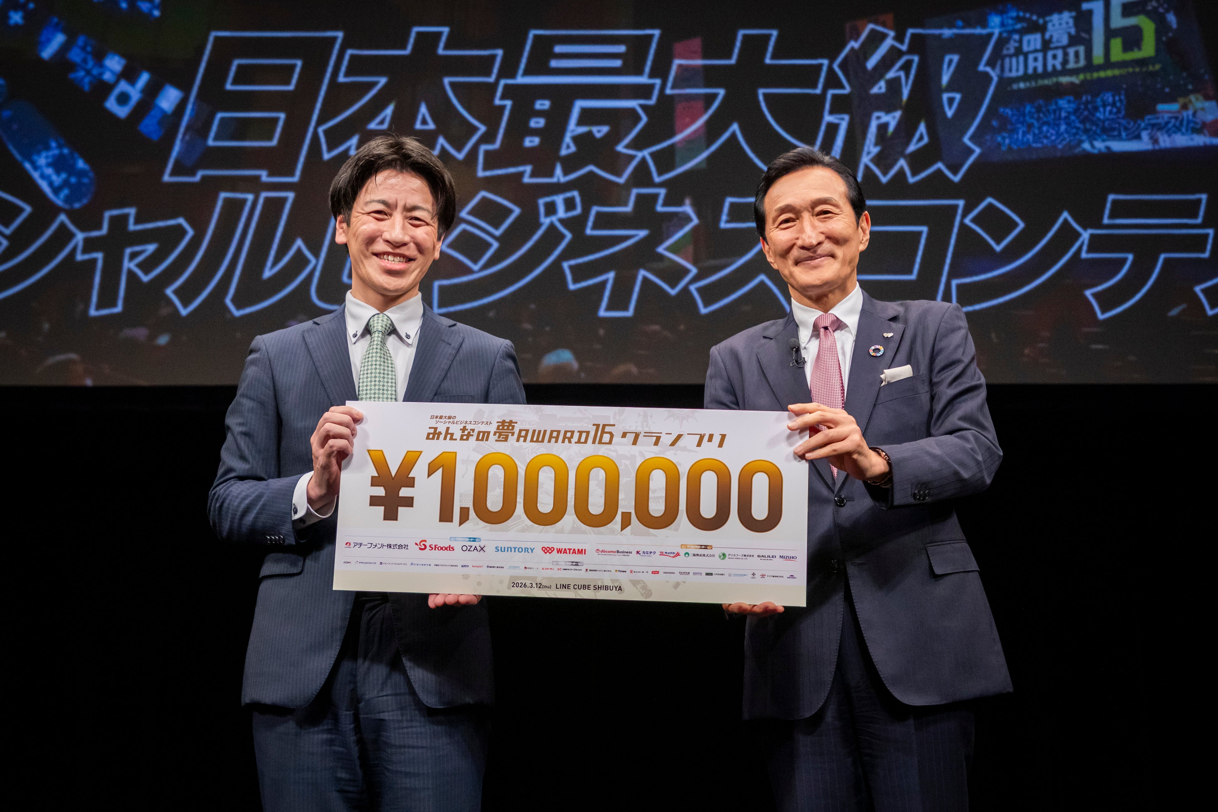 公益財団法⼈みんなの夢をかなえる会(本社:東京都⼤⽥区)は、2026年3⽉12⽇(木)LINE CUBE SHIBUYA(渋⾕公会堂)において、ビジネスプランコンテスト「みんなの夢AWARD16」を開催いたしました。16年目を迎えた今回、全国710のエントリーから、厳しい選考を経て選ばれた8⼈のファイナリストが熱いプレゼンテーションを披露し、厳正なる審査の結果、グランプリと準グランプリ、応援賞が決定しました。