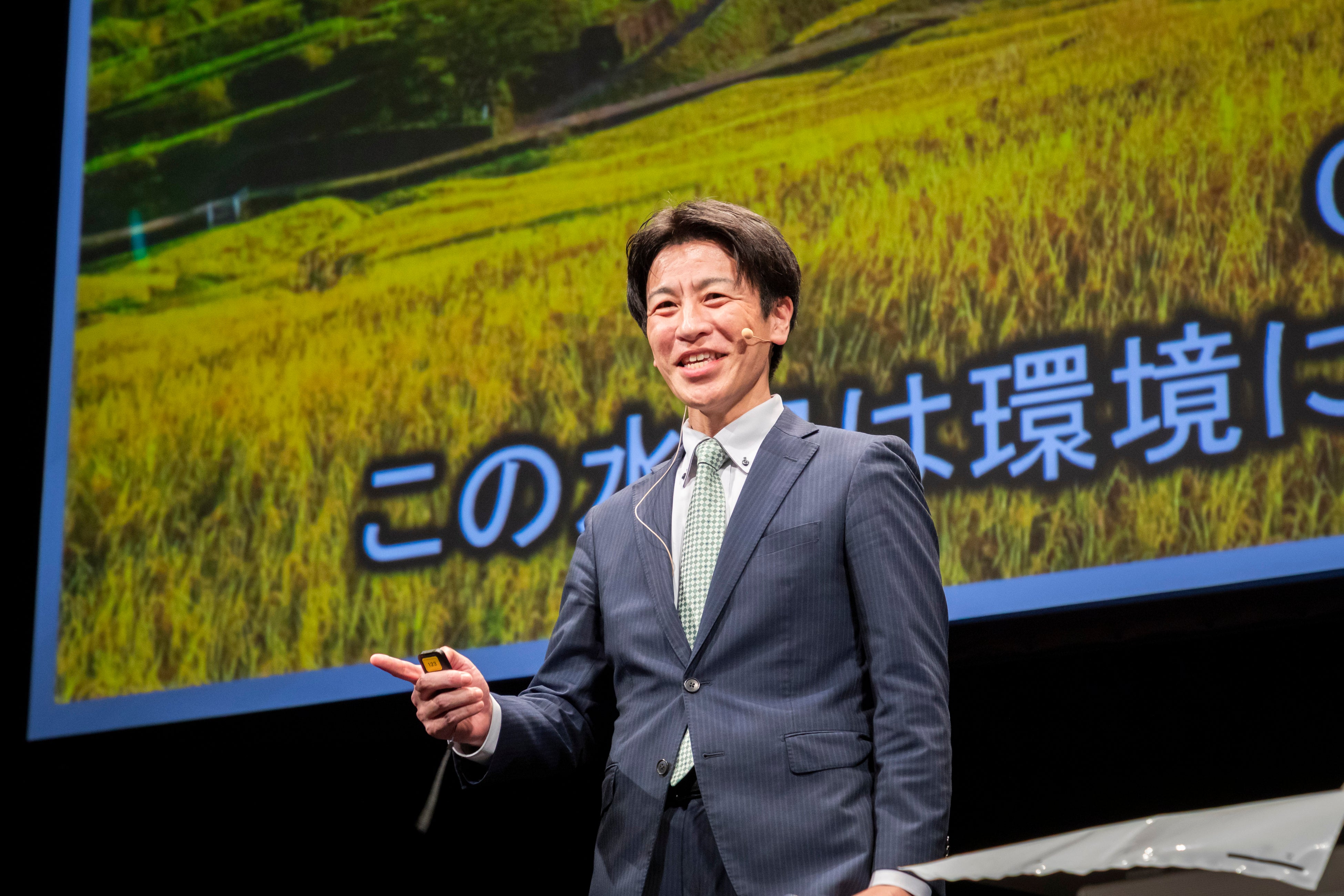 グランプリに輝いたのは、「深層元肥イノベーション ― 肥料3分の1で育つ次世代稲作システム」山根 正博さん。会場とオンラインで観覧いただいている皆さまからの投票で決まる応援賞とのダブル受賞となりました。