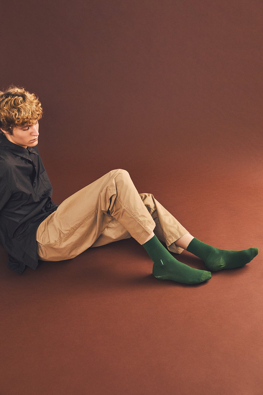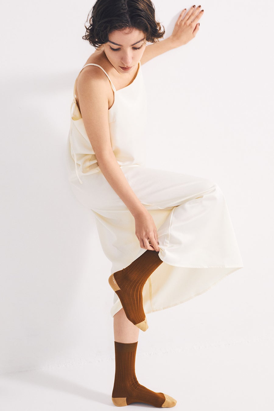 シャリシャリとしたクリスプ感と多色の糸を織り込んで深みのある色合いが特徴の「Crispy」。ルーズに履いてリラクシーかつ上質なムードを提案します。特殊なリブ仕様でワンサイズで22.0cm~27.0cmの足サイズに対応。