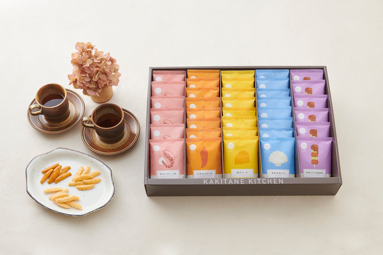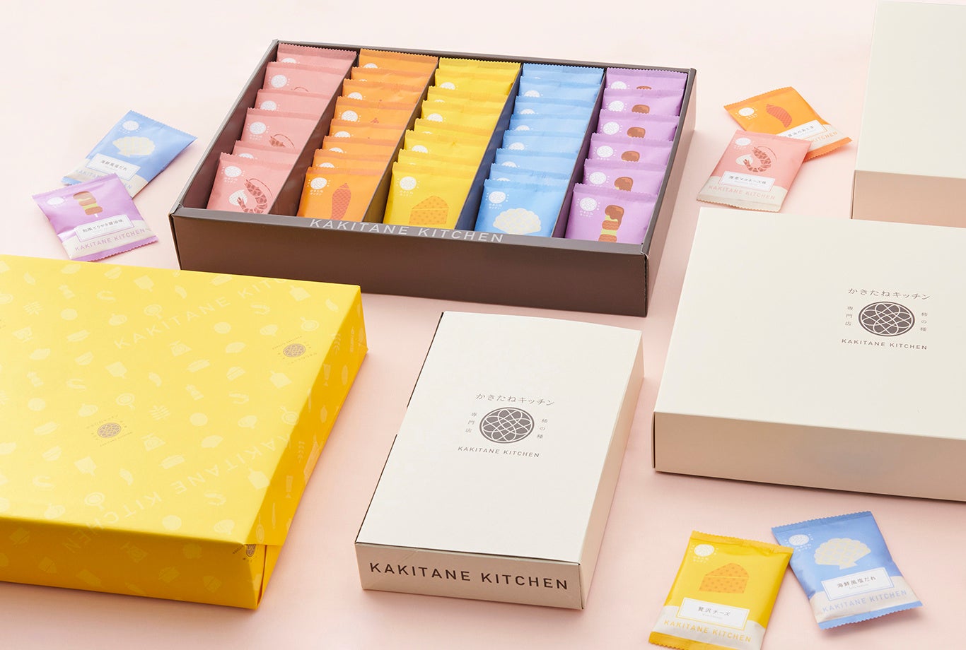 かきたねキッチンの定番のフレーバーを個包装にし、詰め合わせたアソートシリーズ。ちょっとした手土産からフォーマルな贈り物にも対応できる3種類のサイズ展開。