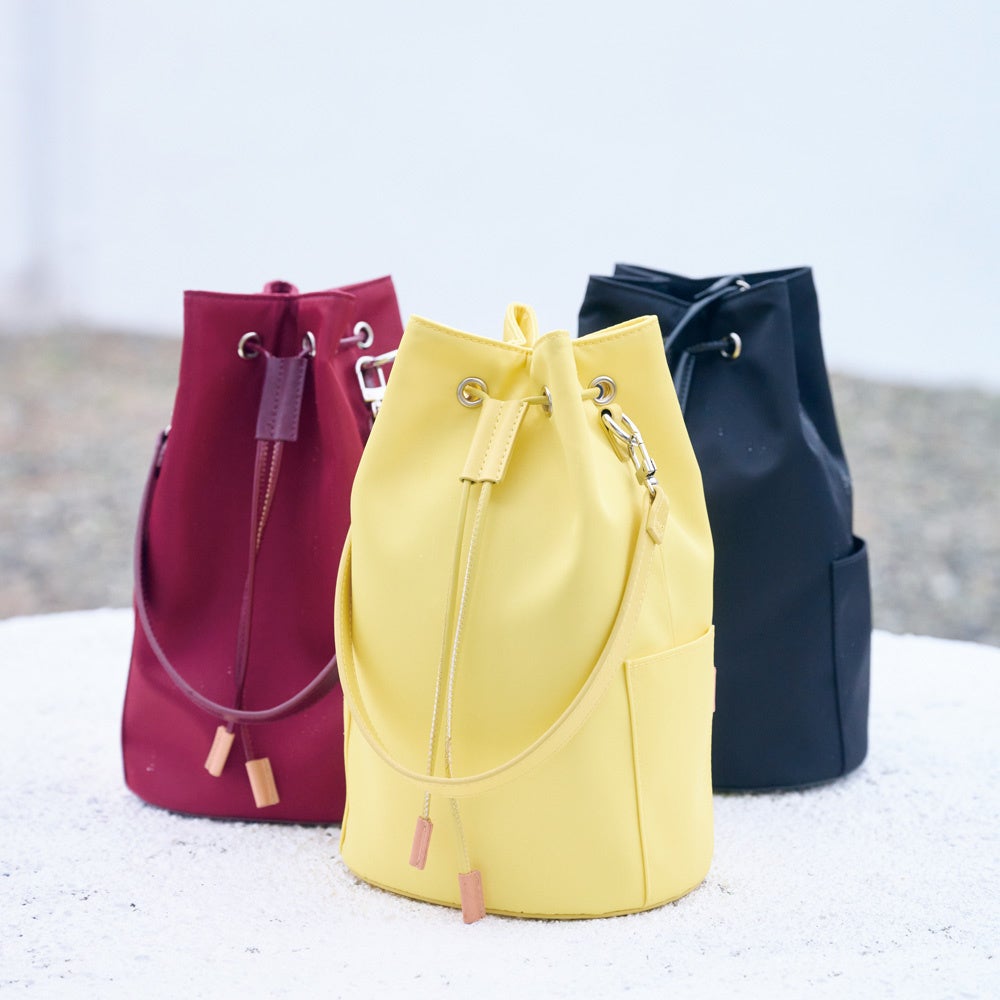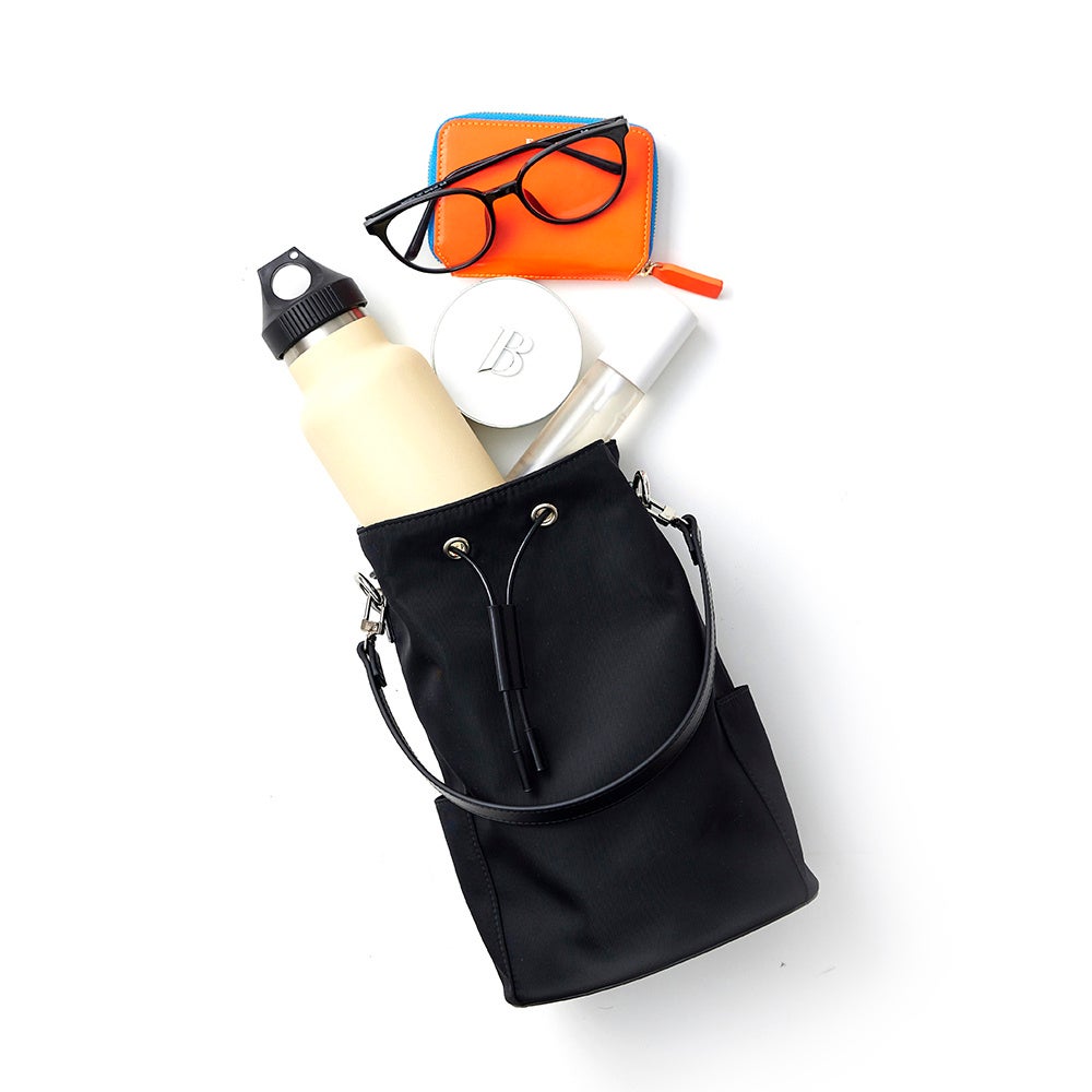 ajewのシンボルアイコンのシルバーリングが特徴的なデザインで、バッグの注目ポイントはナイロン×レザー、異素材ドッキング仕様でキレイすぎずラフすぎない、ミニマムだけど小さすぎない、絶妙なラインを追求し実現した巾着型バッグ。