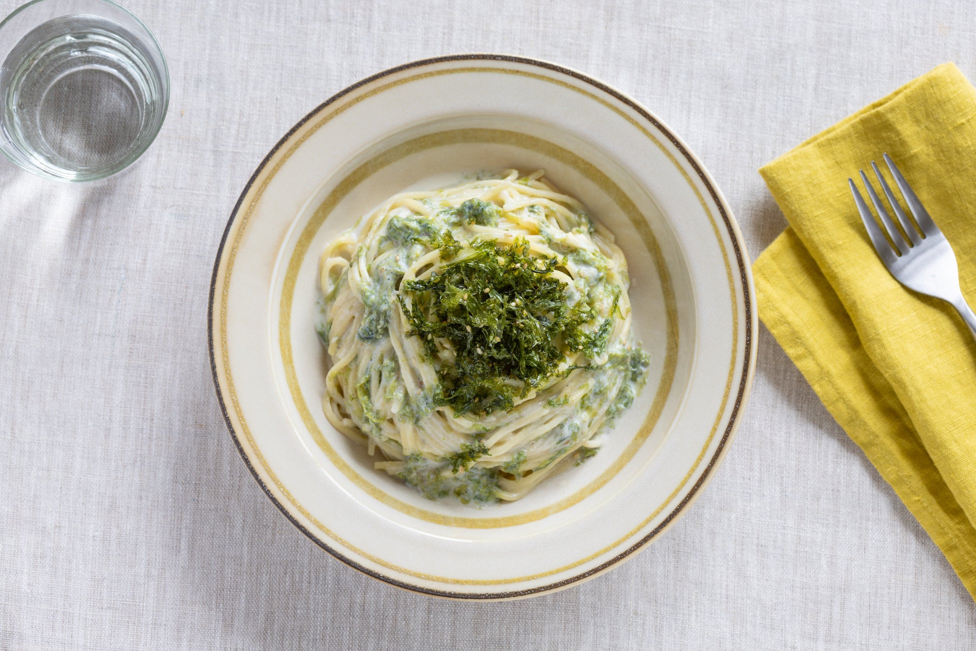 のりの風味が広がるまろやかな豆乳クリームパスタです。フライパンひとつで手軽に作れます。