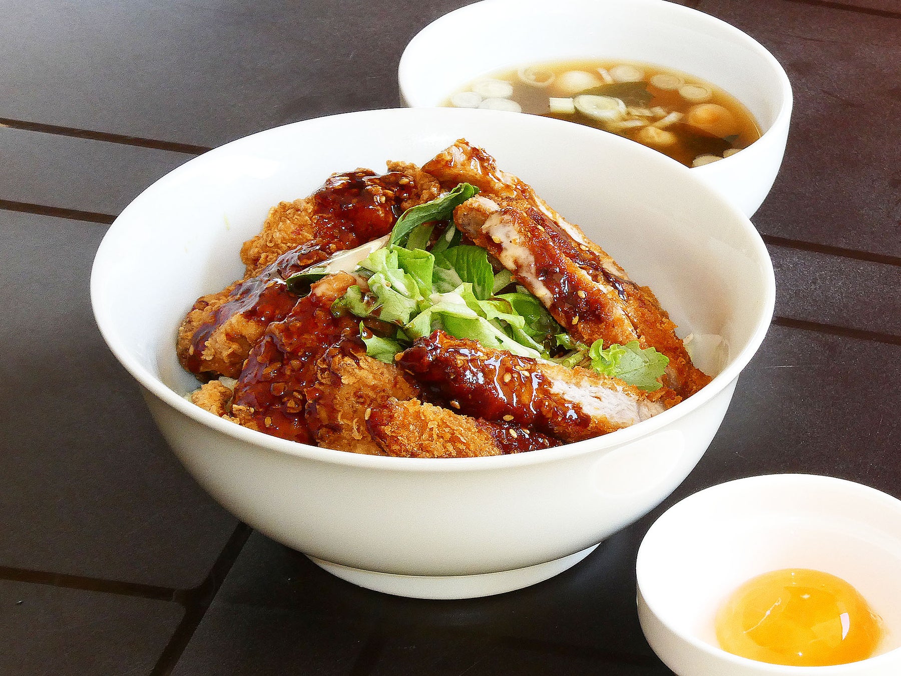 ご飯の上にキャベツ、その上にヤシオポークのカツと、那須鶏の唐揚げをのせました。ベビーレタスを少々そえて甘めのソースをかけております(味噌汁付)。那須御養卵の卵黄をお付けしておりますので、お好みでかけてお召上がり下さい。