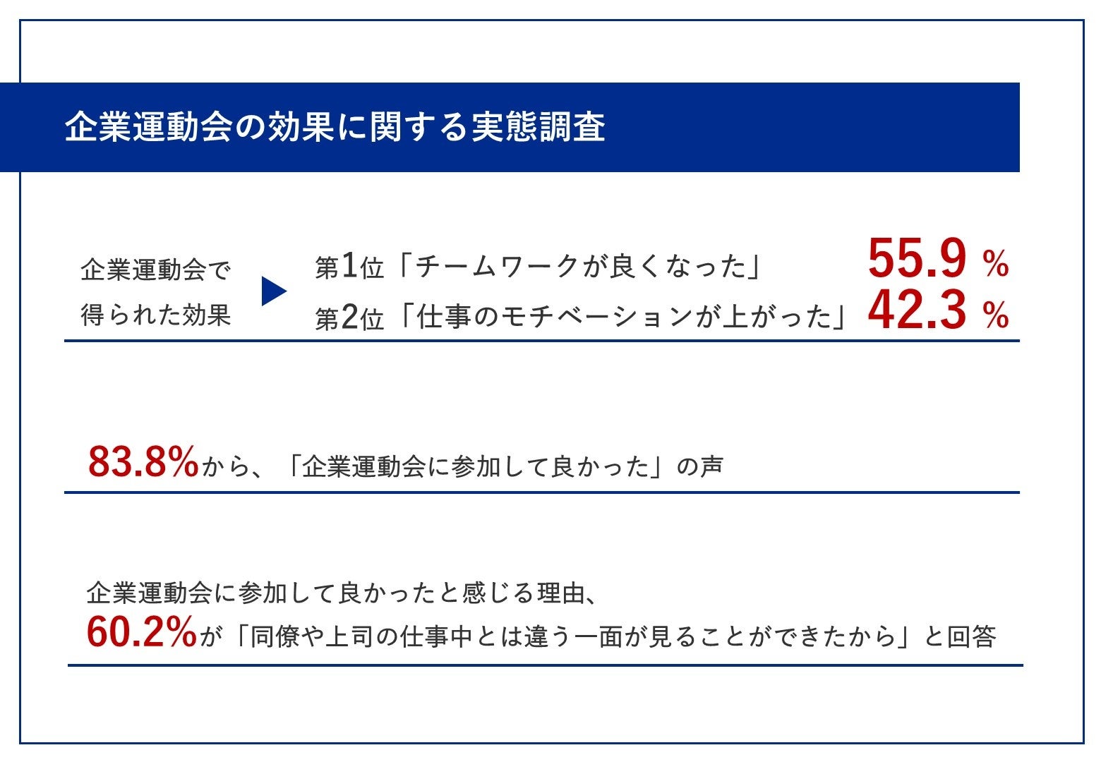 まず、企業運動会の効果については、「チームワークが良くなった」(55.9%)、「仕事のモチベーションが上がった」(42.3%)が挙げられました。また、参加者の83.8%が「企業運動会に参加して良かった」と感じており、その主な理由は「同僚や上司の仕事中とは違う一面が見られたから」が60.2%で最多となりました。また実際に行った競技は、「リレー」(44.1%)、「障害物リレー」(43.2%)、「玉入れ」(35.1%)などが上位となりました。一方で、企業運動会が良くなかったと感じた人は15.3%おり、その理由として、「休日に開催されたから」(47.1%)、「強制的に参加させられたから」(35.3%)が挙げられました。