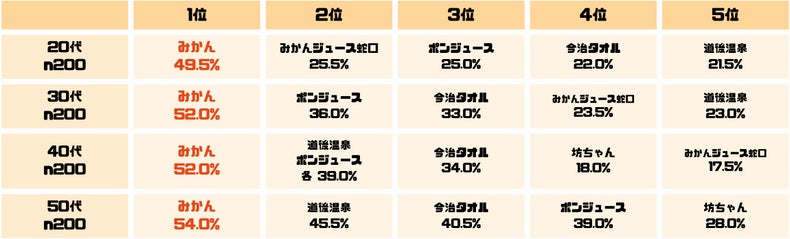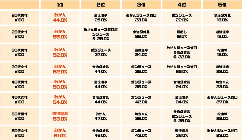 性別・年代別や居住エリア別で見ても、ほとんどで1位が「みかん」となった中で、「中国・四国地方」の方、「50代男性」の方においては1位が「道後温泉」となりました。