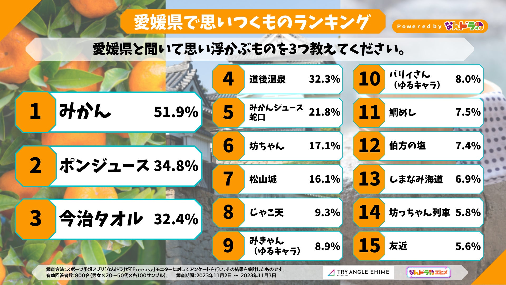 全国の20代〜50代男女800名に聞いた『愛媛県で思いつくもの』、堂々の1位はやはり、「みかん」(51.9%)となりました。