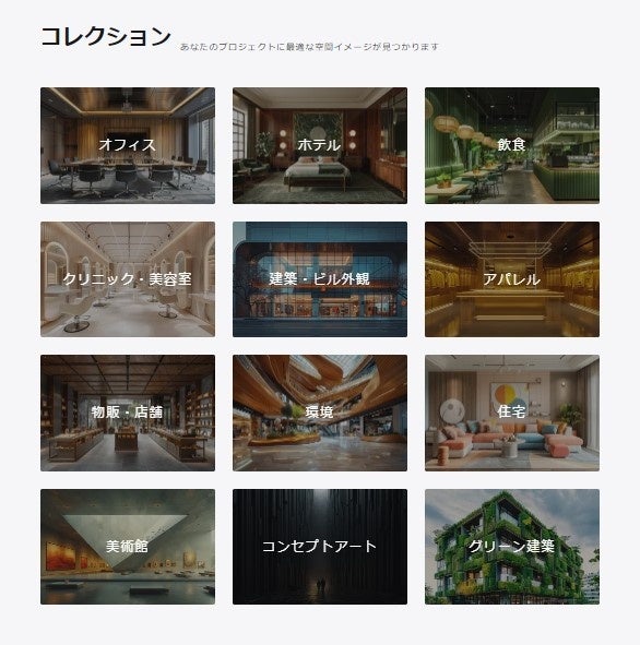 この問題を解決する為、日本の建築パースの”クオリティ”や”トレンド”を熟知した開発スタッフが 1枚ずつ丁寧に生成を行い、カテゴリー毎に画像を格納した新しい画像ストックサイトである『CGBank』をリリースしました。