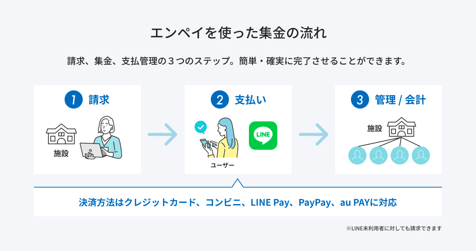『enpay』を導入することで、施設で扱う現金を0にすることが可能かつ、完全ペーパーレスで請求書発行から会計用データ作成までを30分で行っていただくことが可能です。
