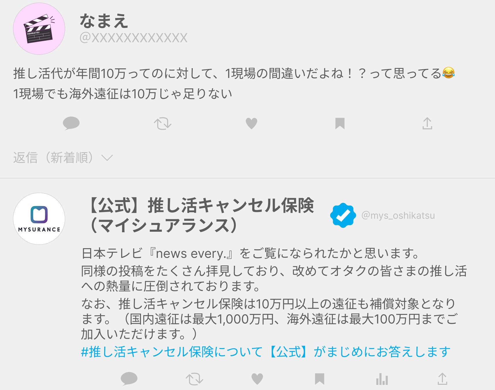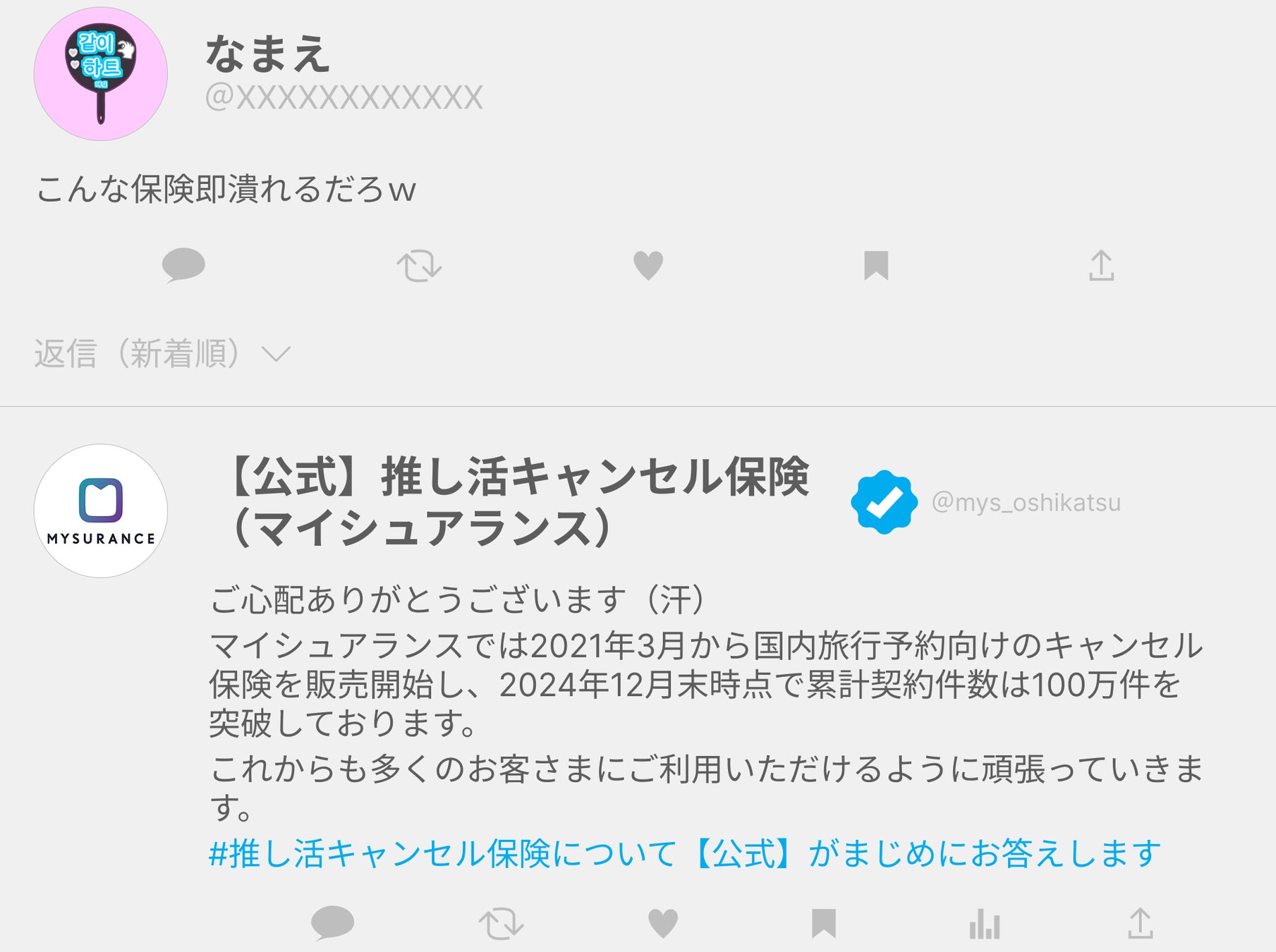 損害保険ジャパン株式会社の子会社で少額短期保険業を営むMysurance(マイシュアランス)株式会社(本社:東京都新宿区、代表取締役社長:清水廣臣、以下「Mysurance」)が展開する「推し活キャンセル保険」が、2025年3月31日のリリース以降、多くのメディアに取り上げられ、SNS上でも大きな反響を呼んでおります。