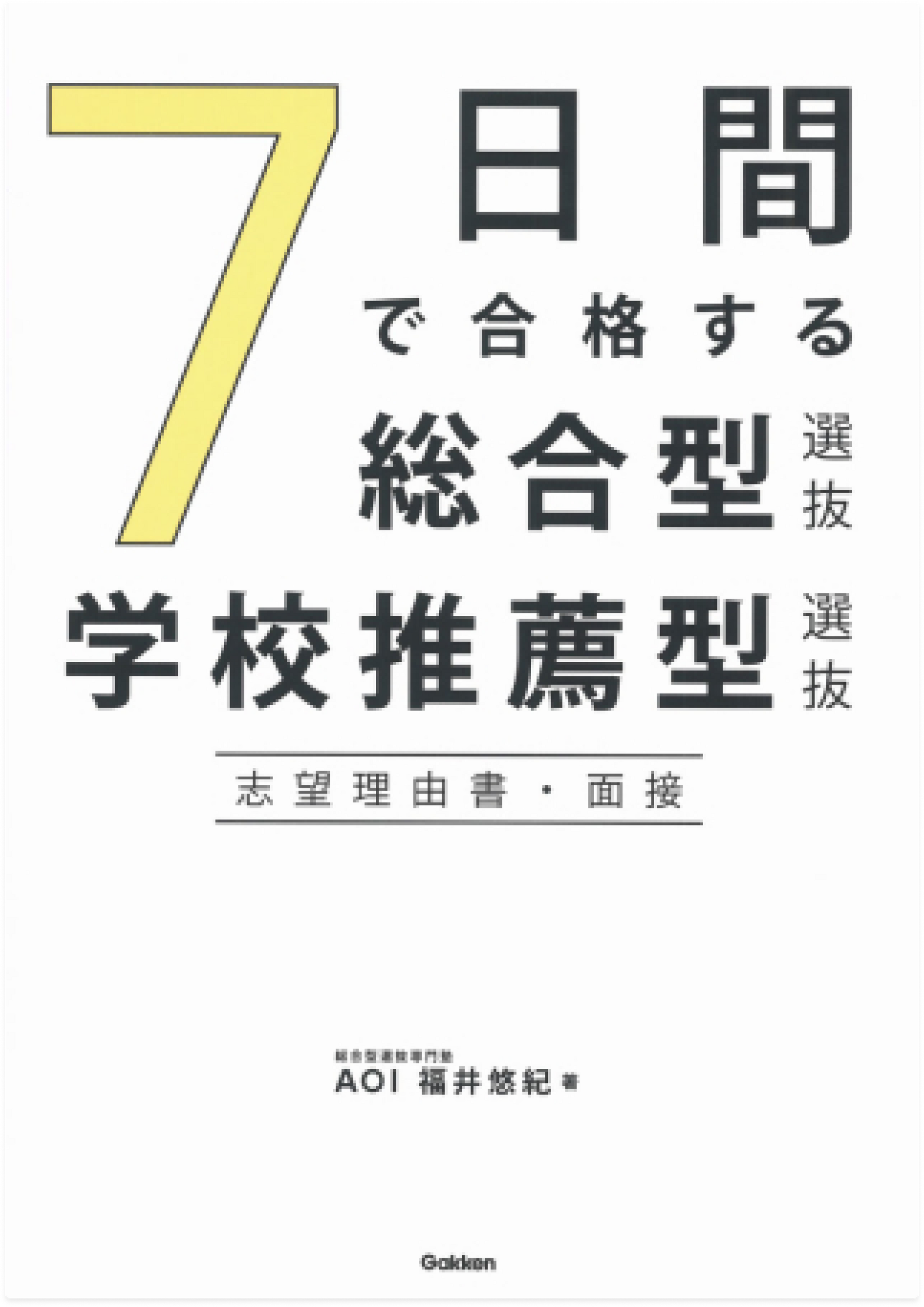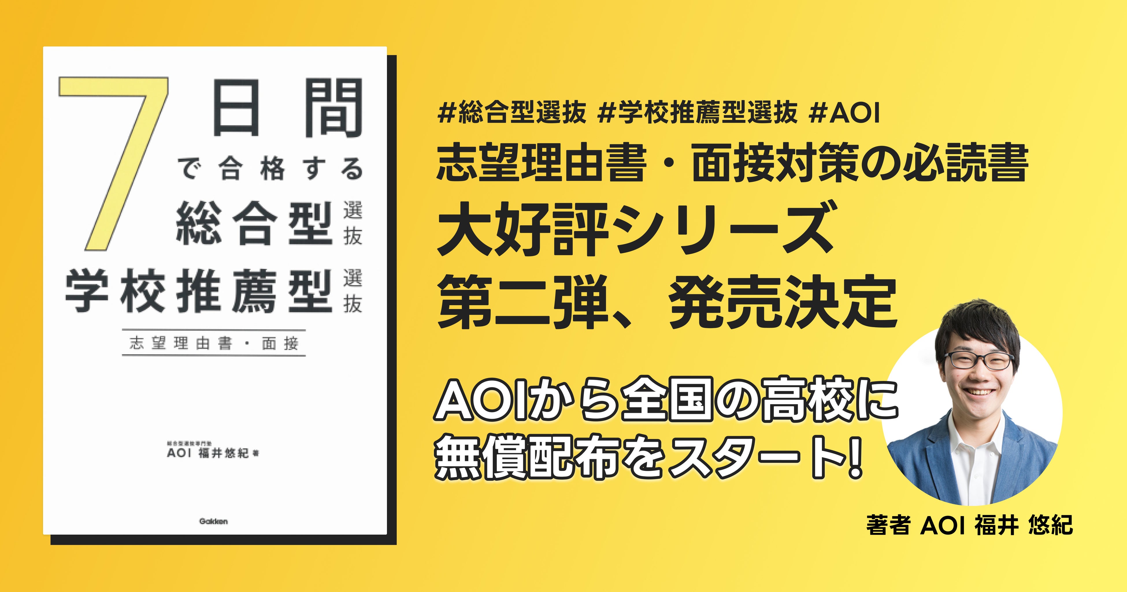 株式会社花形が運営する「総合型選抜専門塾AOI」 (以下 「AOI」)は、学研出版より待望の「7日間で合格する」シリーズ第二弾を発売しました。第一弾の「7日間で合格する小論文」が好評を博し、売上2.4万部を記録した本シリーズ。今回は、総合型選抜の志望理由書・面接特化の対策教本が発売されました。