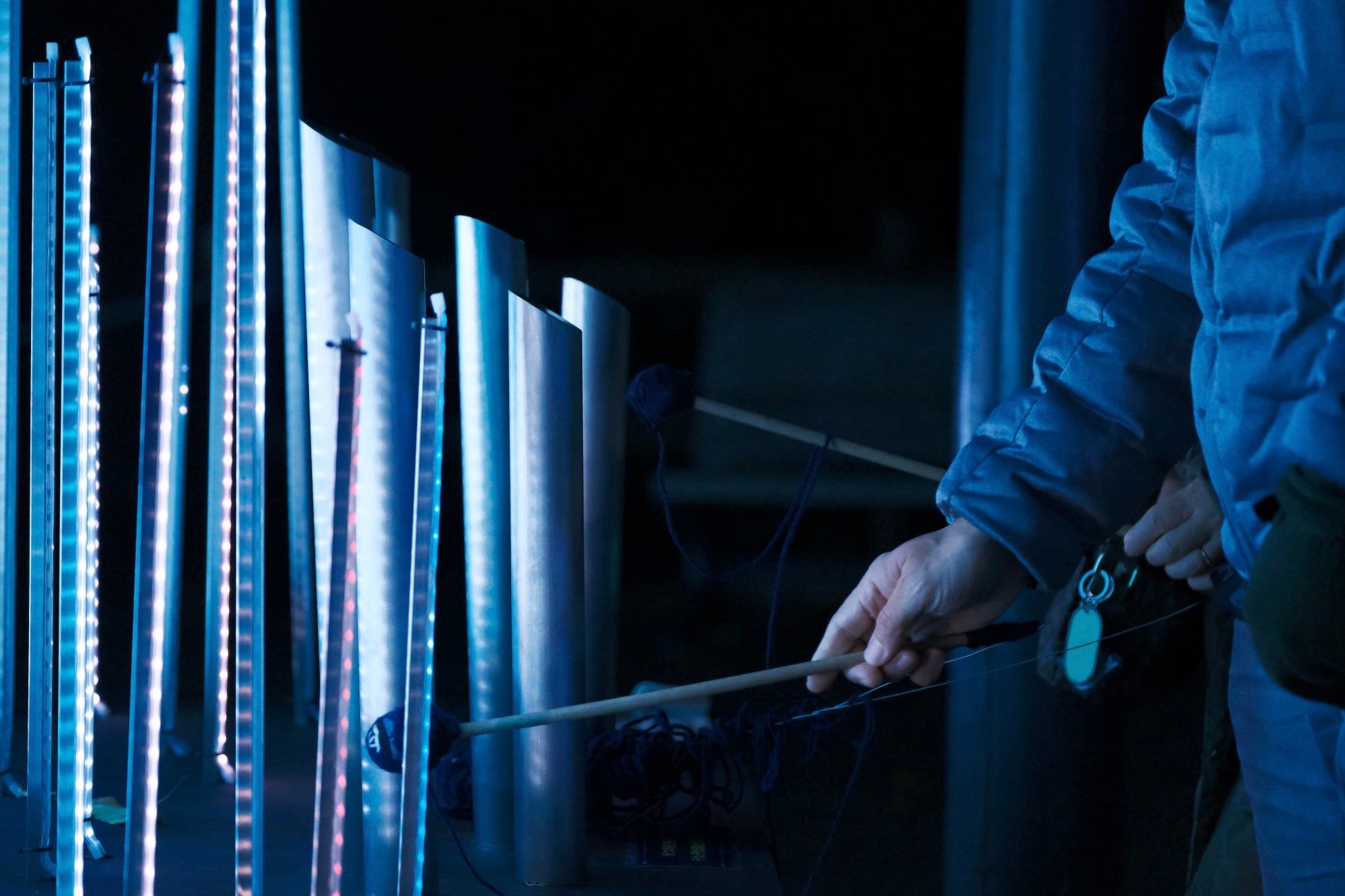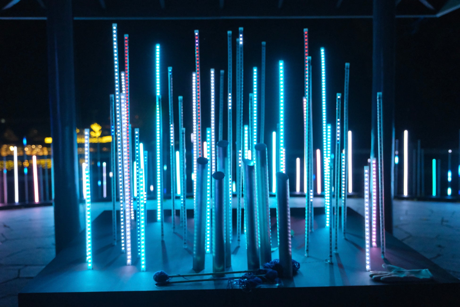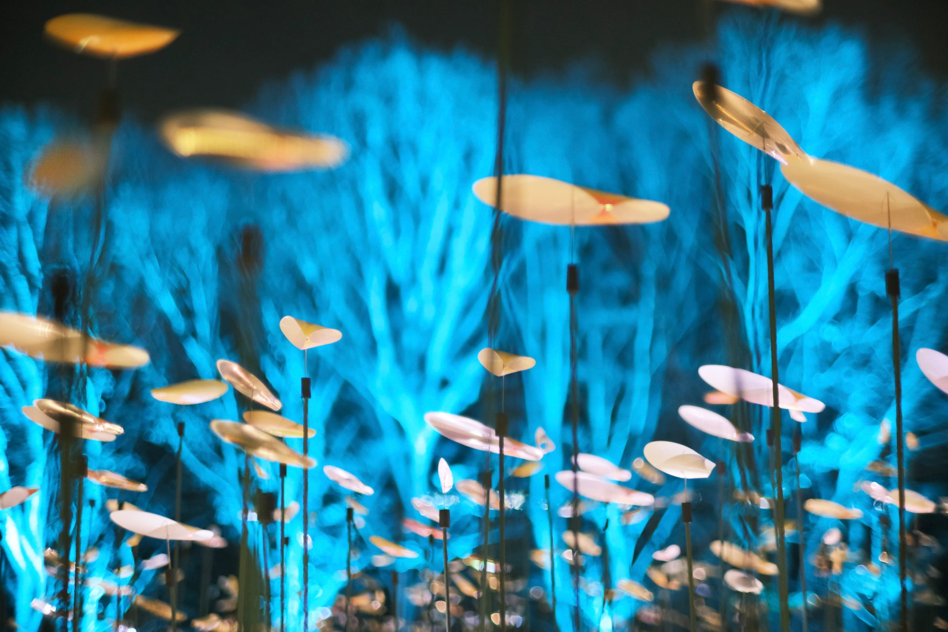 広々とした芝生のグリーンヒルに設置された2000本の風見鶏によるモビールスケープ。風に揺られると、日中は陽の光を受けてキラキラと輝き、夜は幻想的な灯りで園内を彩る、小松 宏誠氏作の自然を可視化したアート。