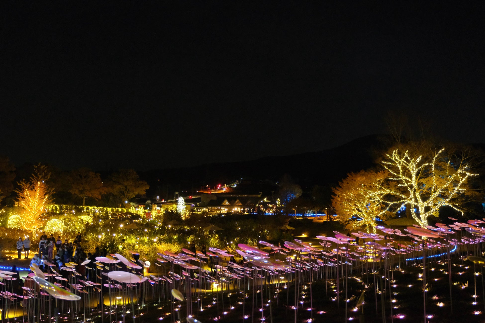 澄んだ空気のなか、星が煌めく里山の冬。キラキラとやさしい灯りに包まれた幻想的な花と自然を眺めながら、寛ぎのひと時をお過ごしください。