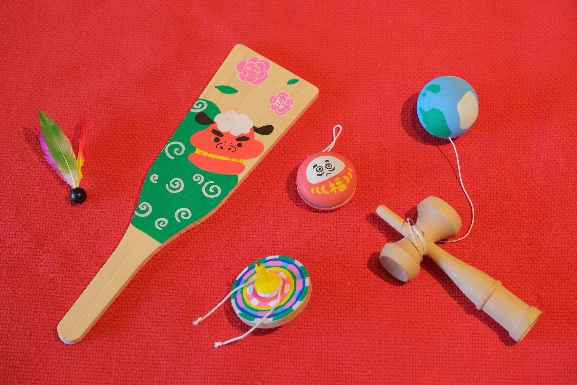 お餅つき体験&お餅のふるまいのほか、お絵かきできるけん玉や羽子板、コマなどの体験をご用意。