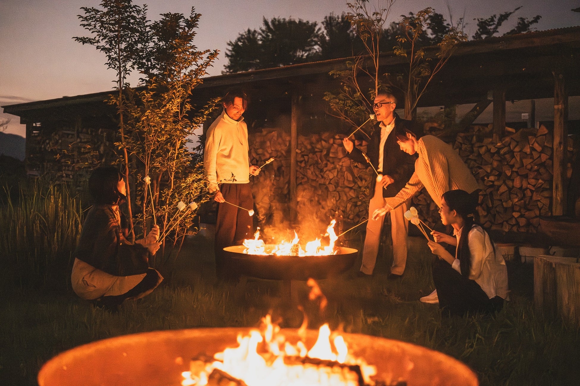 マシュマロや自家製ベーコン、カマンベールチーズに加えて、きりたんぽも登場!焚き火の爆ぜる音に耳を傾けながら、揺らぐ炎に心も体も温まる時間をお過ごしください。