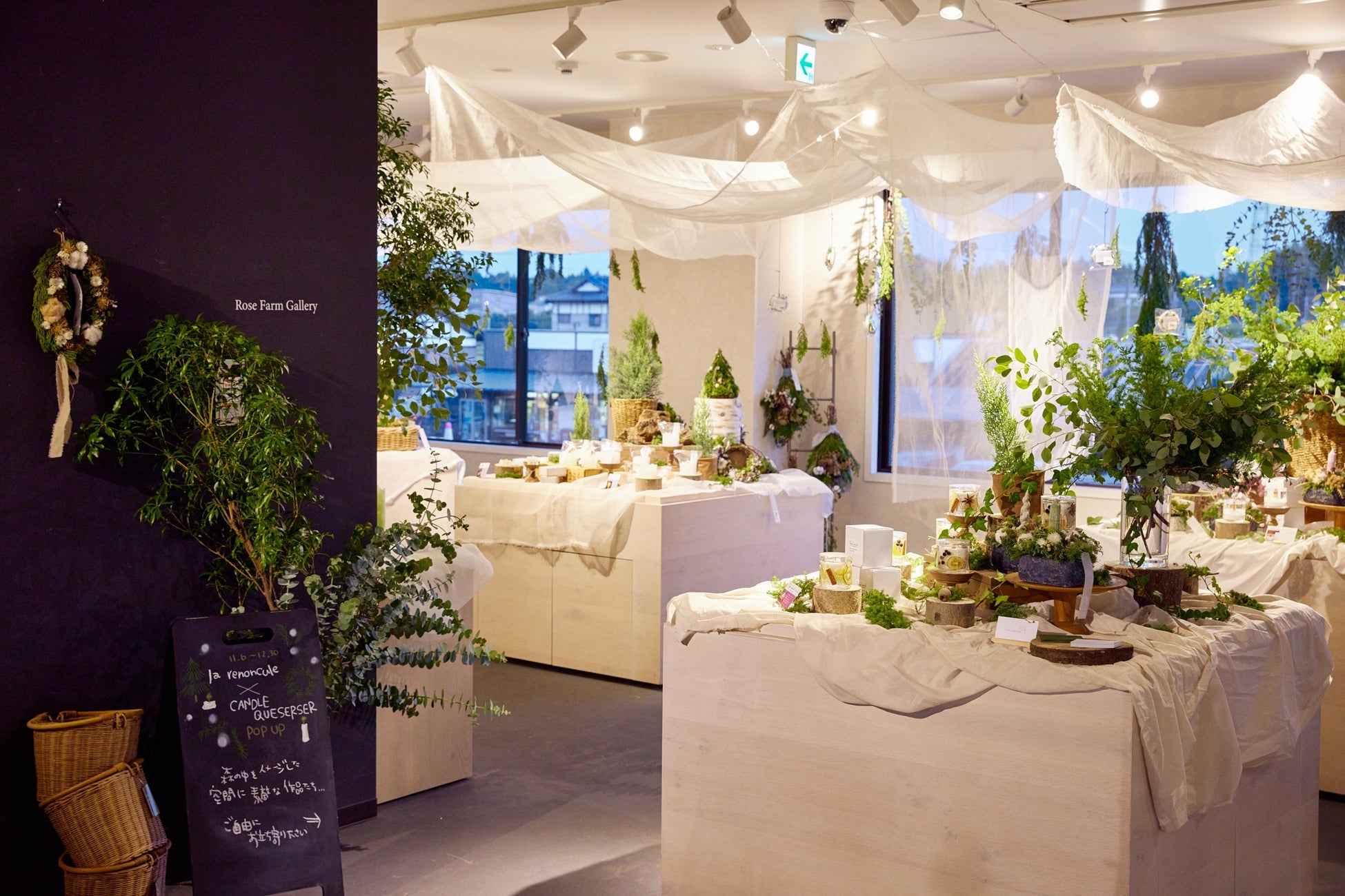 入園料無料のマーケットギャラリーでは、茨城県内の作家「la_renoncule」と「candlequeserser」による、森の中をイメージした針葉樹の香りに包まれた装飾の中で、クリスマス飾りやお正月飾り、キャンドルなどを展示販売するPOP UPを開催中。
