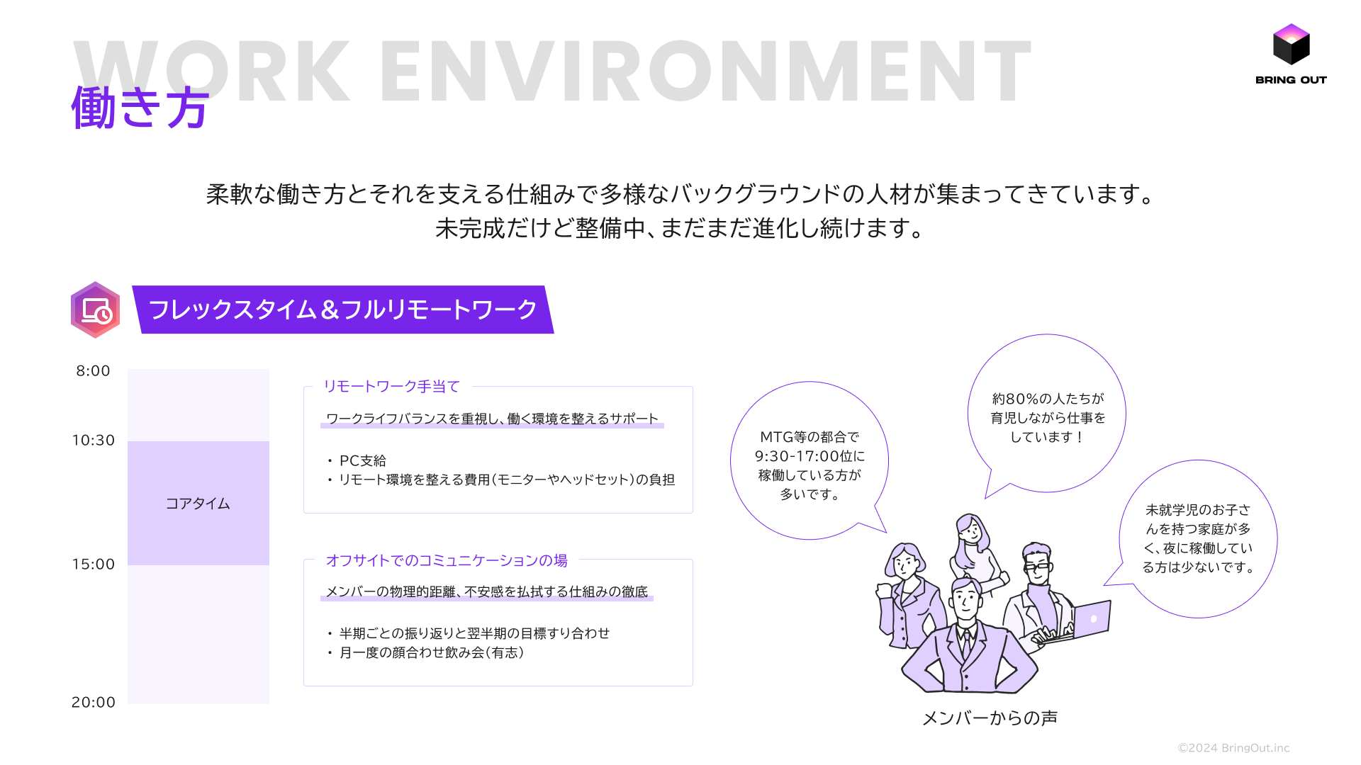株式会社ブリングアウト(本社:東京都中央区、代表取締役:中野慧、以下 ブリングアウト)は、創業時から「全社員フルリモート」で働くスタートアップです。自由に働く場所を選びながら、仕事にも家庭にもフルコミットしてのカルチャー。