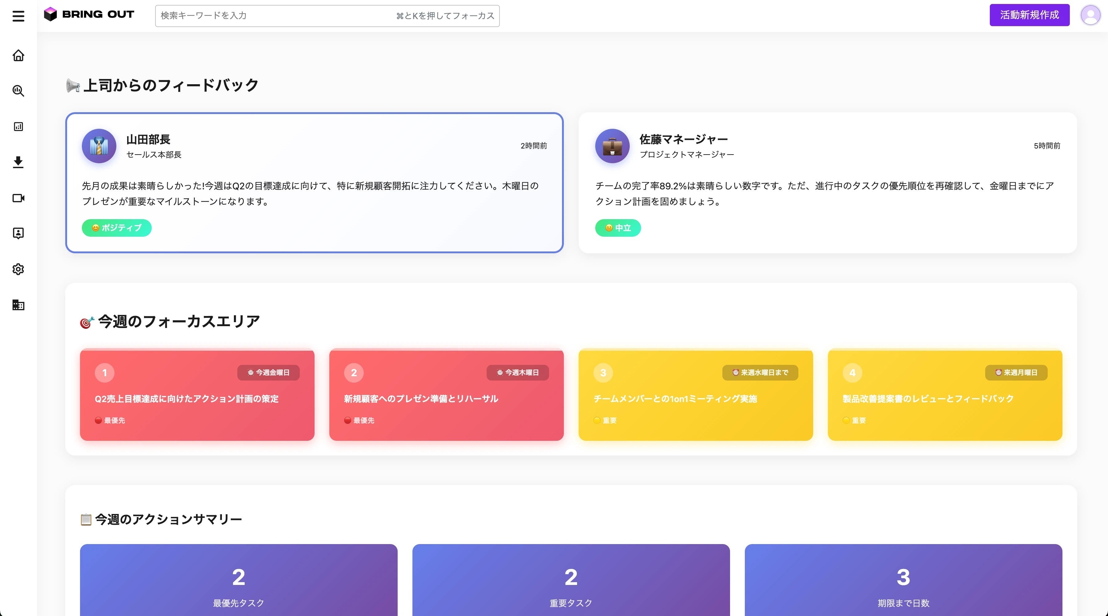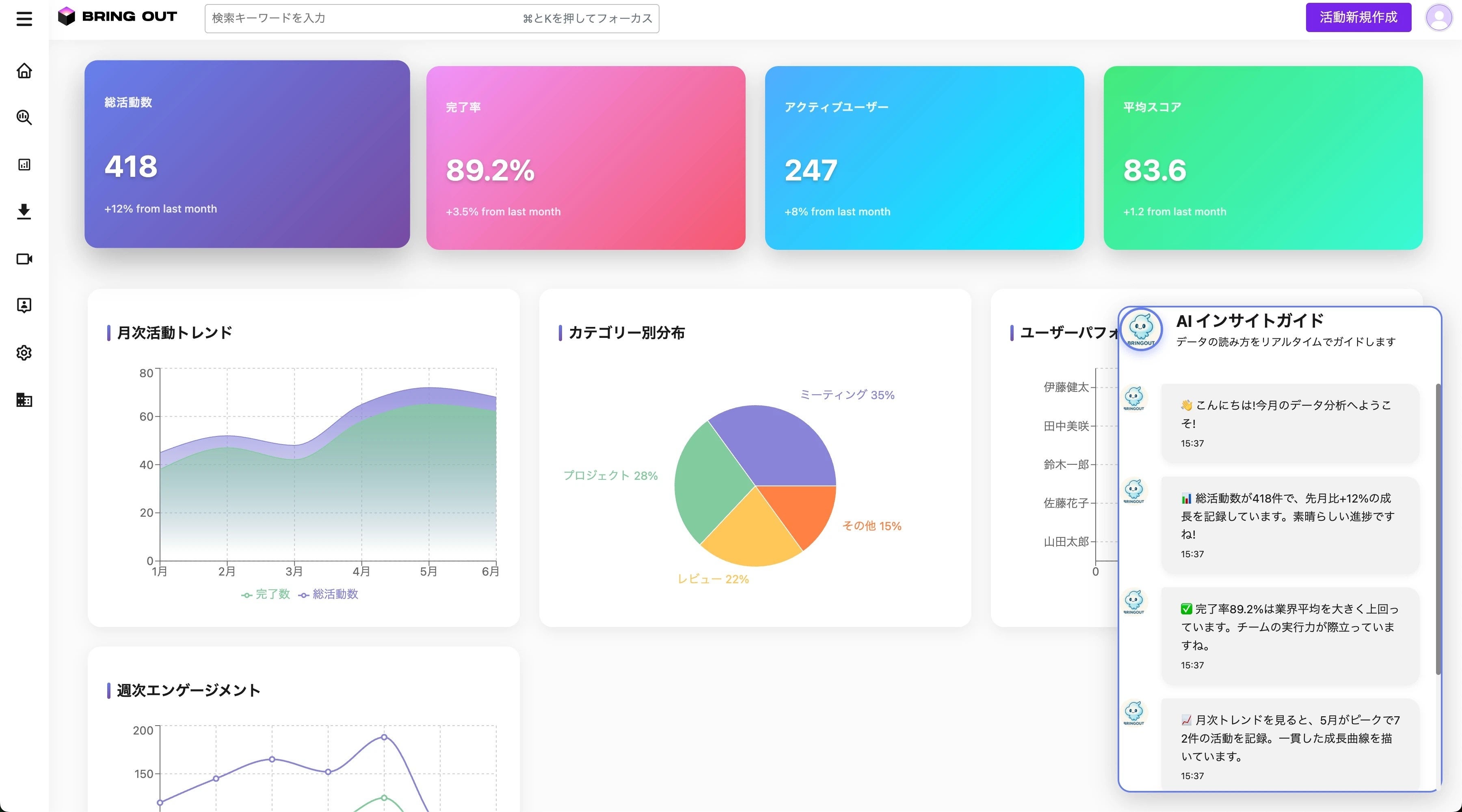 分析結果をもとに、要約・洞察・提言などを自動生成。組織が無理なくエージェントを使い続けることで、「経営変革を常在化」させます。