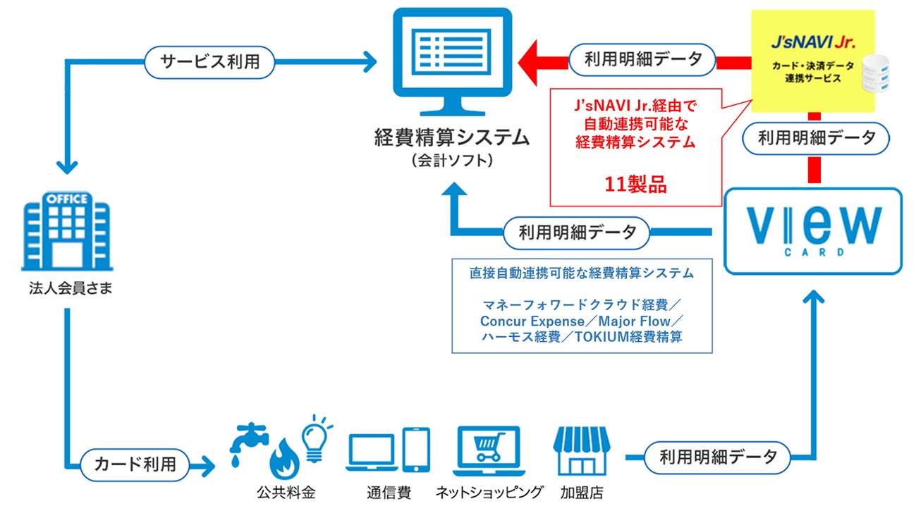 経費精算システム連携サービスをお申込みいただきますと、『ビュー法人カード』ご利用明細データは、『J’sNAVI Jr.』を経由し提携しているワークフロー・経費精算システムへの自動連携が可能になります。