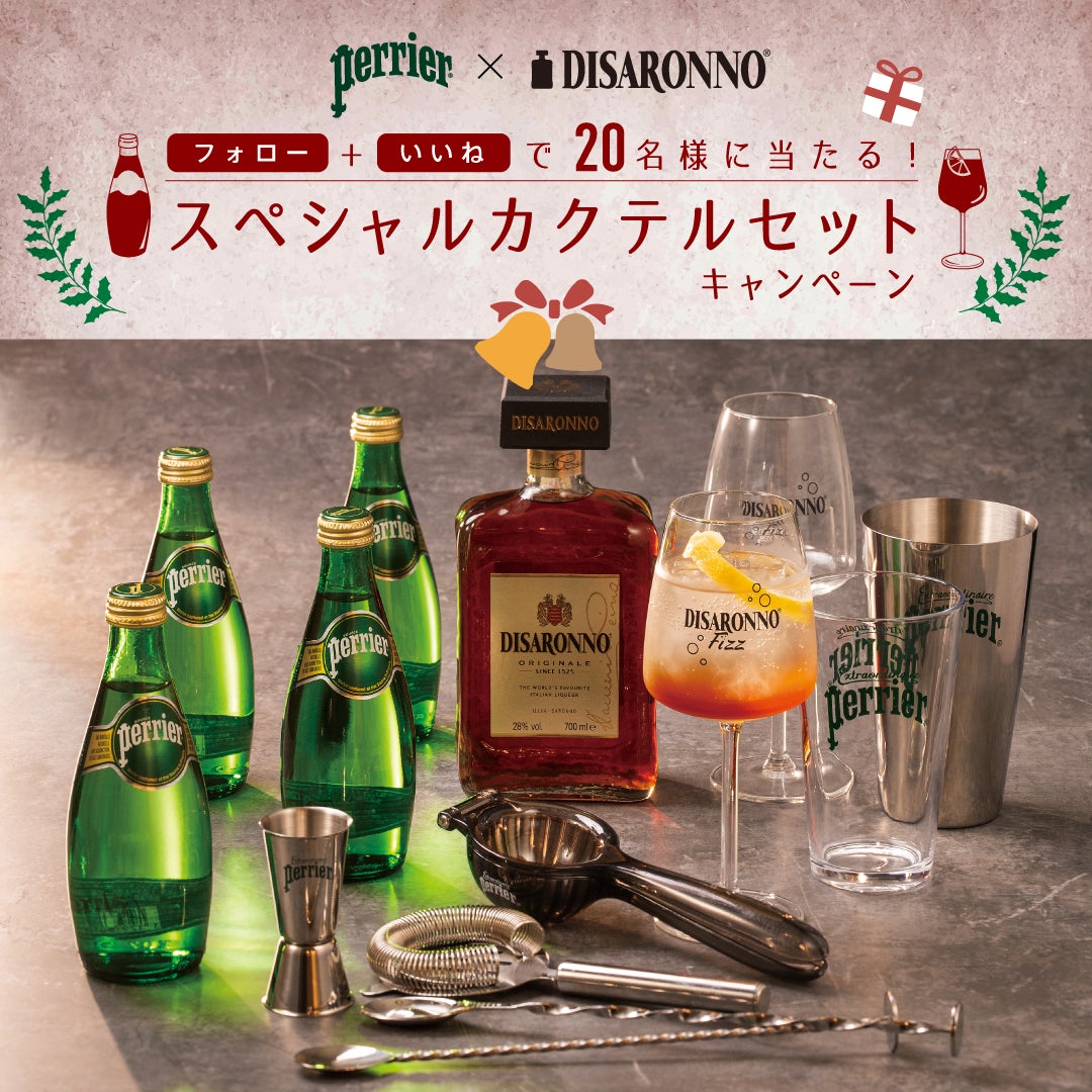 抽選で20名様に、ディサローノとオリジナルフィズグラス、ペリエ330mlと