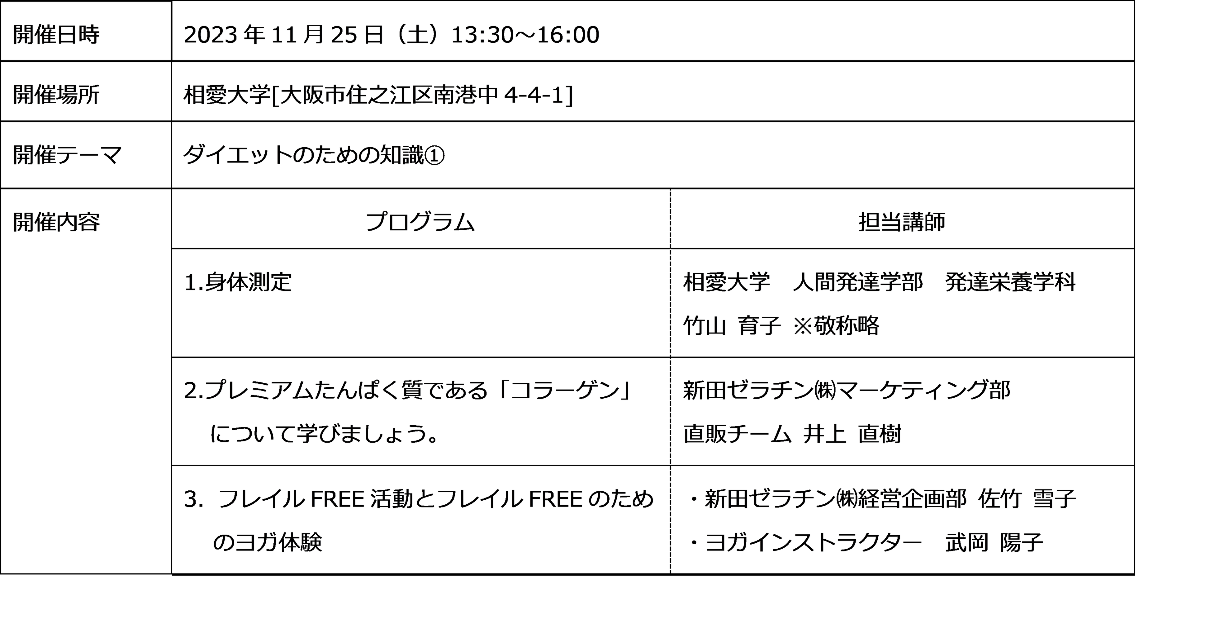 新田ゼラチン株式会社(代表取締役社長:尾形浩一、本社:大阪府八尾市)は、相愛大学(学校法人相愛学園 大阪市住之江区)が主催する一般生活者の方を対象とした゛相愛大学 土曜公開講座「ヘルシーダイエット教室」”(以下、「本教室」という)に初めて参加いたします。弊社は、本教室の開催目的(食事と運動の知識を身に着け、健康な身体づくりをする)に賛同し、11月25日(土)開催教室にてコラーゲンペプチド摂取による健康増進効果に関する講義、並びにフレイル予防活動の一環である“フレイルFREEヨガ”の体験会を行いますのでお知らせします。