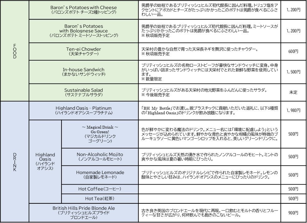 Highland Oasisでは、下記のとおりのメニューが提供されます(変更の可能性あり)。