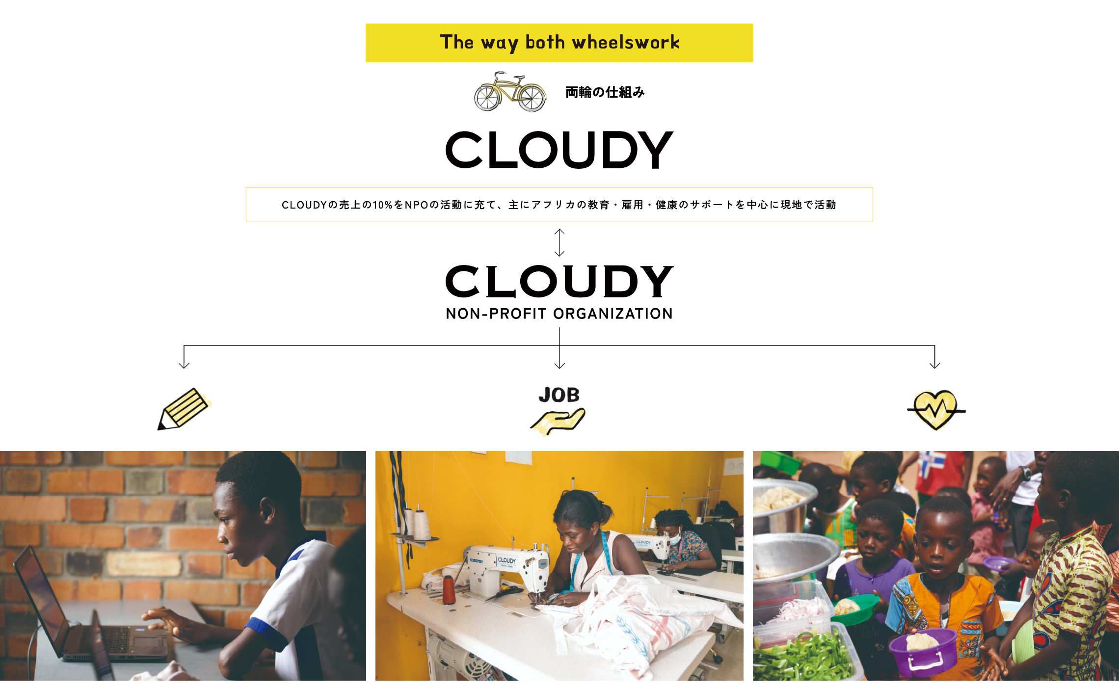 “Opportunities and Choices for the Future(機会と選択肢がある未来を)”を組織のミッションとして掲げ、CLOUDYとNPO CLOUDYが自転車の前輪と後輪のような関係性で世の中に溢れる社会課題にアクションを起こしていきます。時にはCLOUDYがリードして新しいフィールドを開拓し、NPO CLOUDYが現地での活動を実施する。また、ある時はNPO CLOUDYがグローバル社会における課題解決へ糸口を見つけ出し、CLOUDYがその活動を後押しする、という両輪で動きながら、着実に前に進む組織として発展していきたいという想いがあります。