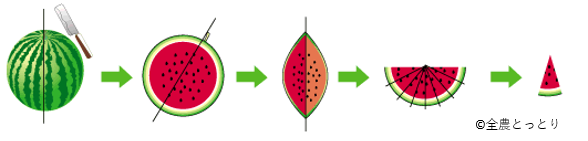スイカは中心部分が一番甘くなるので、図のように中心部から包丁を入れることで甘い部分を均等に分けることができます。