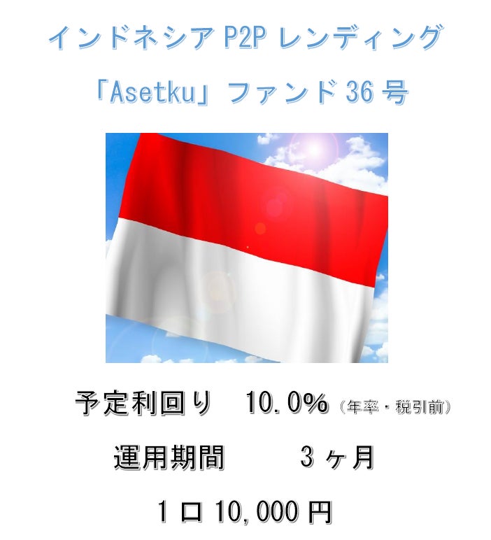 当ファンドは、元本が保証されているものではなく、貸付先の財務状況や、貸付事業の状況、インドネシア等関係各国の政治・経済の情勢等の変化により、損失が生じるおそれがあります。