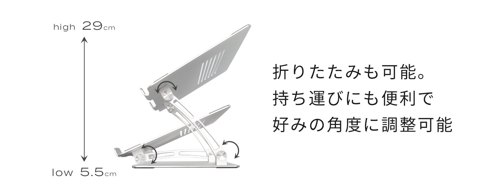 高さは5.5cm~29cmまで調整可能。折りたたみ時は3.5cmまで小さくなるので、持ち運びにも便利です。
