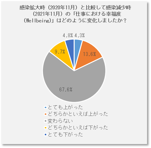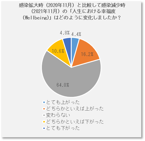 | ・コロナ前(2019年11月)と比較して感染拡大時(2020年11月)は人生における幸福度(Wellbeing)が下がった方が上がった方を上回っていましたが、感染拡大時(2020年11月)と比較して感染減少時(2021年11月)は人生における幸福度(Wellbeing)が上がった方が下がった方を上回っています。 ・いずれの時点においても、約6割の方がコロナ禍により人生における幸福度(Wellbeing)の面で変化を感じていないことがわかりました。 |