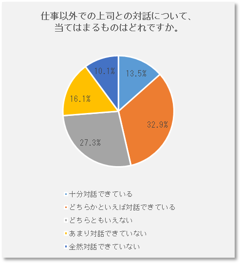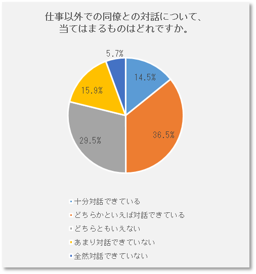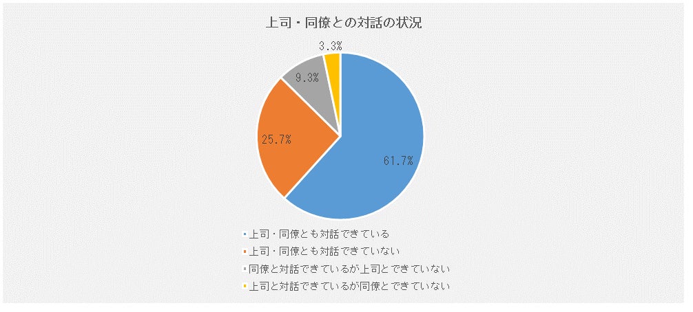 | ・約半数の方が上司・同僚との対話ができていると回答している一方で、約2割の方は対話ができていないことがわかりました。 ・上司と対話できている場合、概ね同僚とも対話できている傾向にあるため、職場のコミュニケーションを活発化させるために、上長や管理職の役割が重要であることがうかがえます。 |